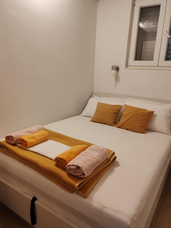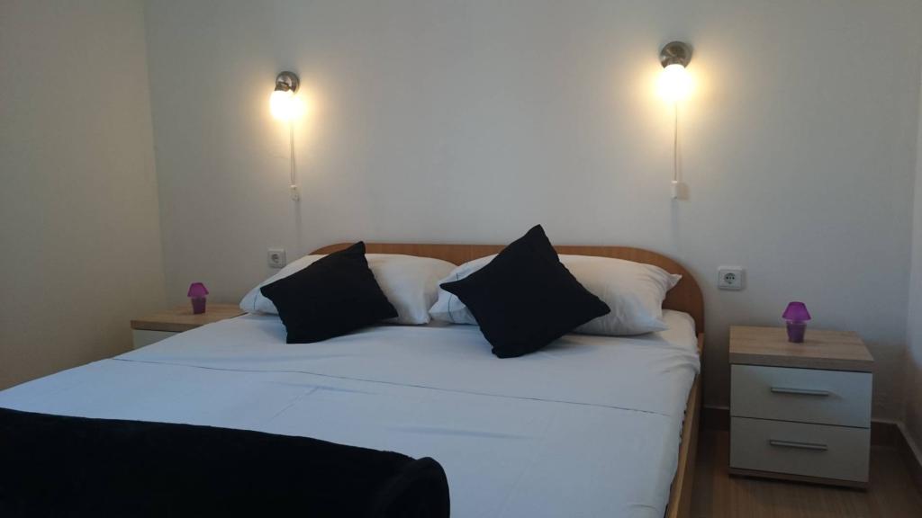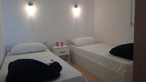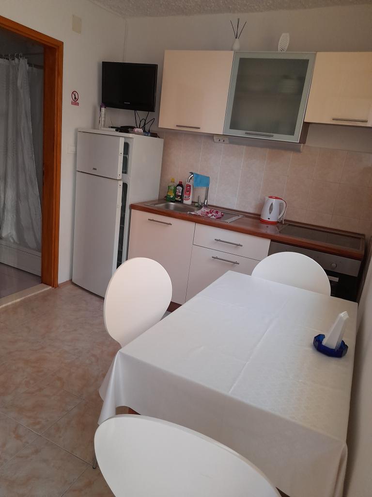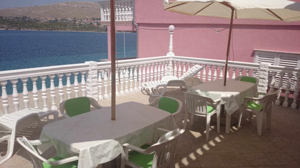 Apartmány 7 metrů od moře pro 7 - 8 osob na terase o rozloze 34 m2 s výhledem na moře. Apartmány mají kuchyň s kuchyňským a servírovacím nádobím, obývací pokoj s rozkládací pohovkou pro relaxaci nebo spaní, satelitní TV, klimatizaci, přístup k internetu, 3 ložnice (2 dvoulůžkové pokoje a 1 třílůžkový pokoj) s ručníky a ložním prádlem, přistýlku, koupelnu se sprchou, toaletou a pračkou, gril. Na terase je zahradní nábytek pro 8 osob, lehátka, 2 kola, parkování, pláž je 7 metrů od apartmánu. Máme mobilní supermarket (minibus), který nás zásobuje základními potřebami před apartmánem. Toto je ideální místo pro dovolenou s dětmi, příbuznými nebo přáteli.