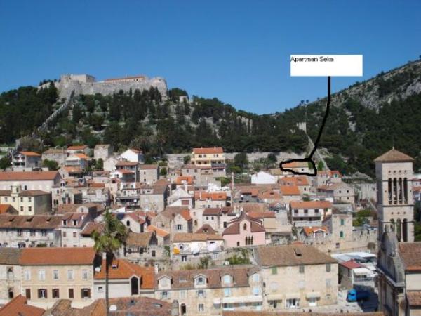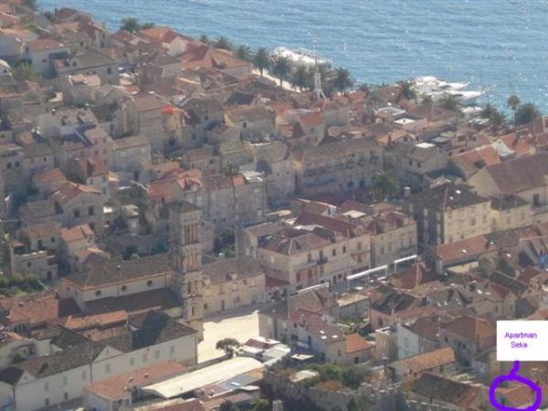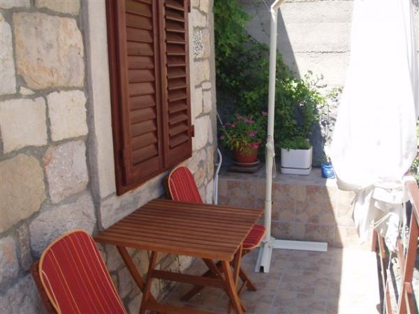 Dům se nachází v historickém zóně, v samém centru města Hvar, a městské hradby, jen pár metrů od hlavního náměstí. Na terase, ve stínu městských hradeb si můžete vychutnat naprosté ticho, soukromí a pohodlí. Byt je moderně zařízený, ložnice pro dvě osoby, koupelna se sprchovým koutem, kuchyň, terasa, klimatizované s TV se satelitním příjmem. Navštivte nás!