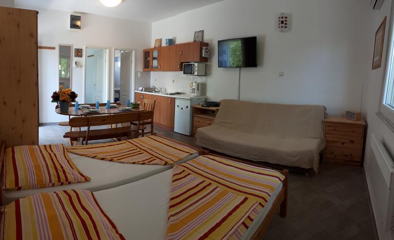 Pobytová taxa je v ceně.Vybavení: klimatizace, SAT-DVB TV, DVD, všechny pokoje elektricky vytápěné, kuchyně vybavená - lednicí, dvojitou varnou deskou, dřezem, mikrovlnnou troubou, kávovarem na filtrovanou kávu, toustovačem, varnou konvicí a veškerým příborem, nápoji a kuchyňským náčiním. Postele mají hotelové matrace, letní peřiny a bavlněné povlečení. Každá postel je vybavena komodou pro každého hosta a každý apartmán má třídveřovou šatní skříň na oblečení a cestovní potřeby s vestavěným trezorem. Koupelny mají šatní skříň - na kosmetické a toaletní potřeby, vestavěný hotelový fén, ručníky. Veškeré truhlářské práce - okna jsou vybavena sítěmi proti hmyzu. Každý apartmán má vlastní terasu s betonovým posezením a slunečníkem. Soukromé parkování na pozemku.