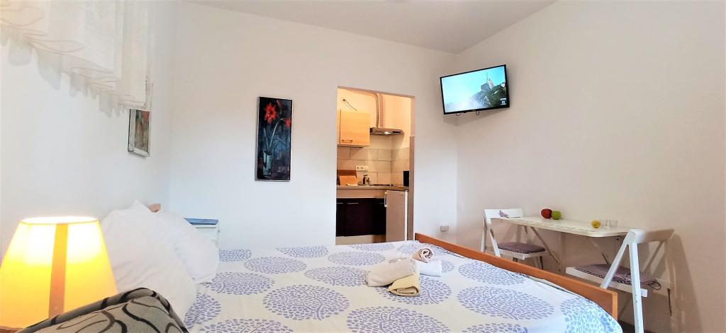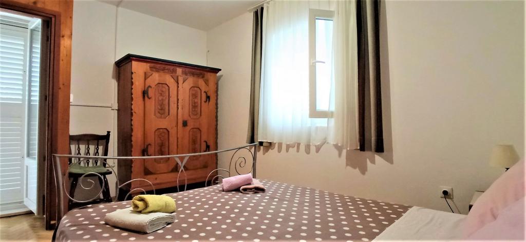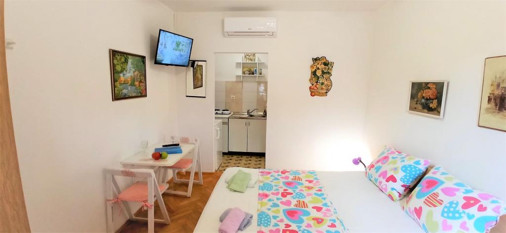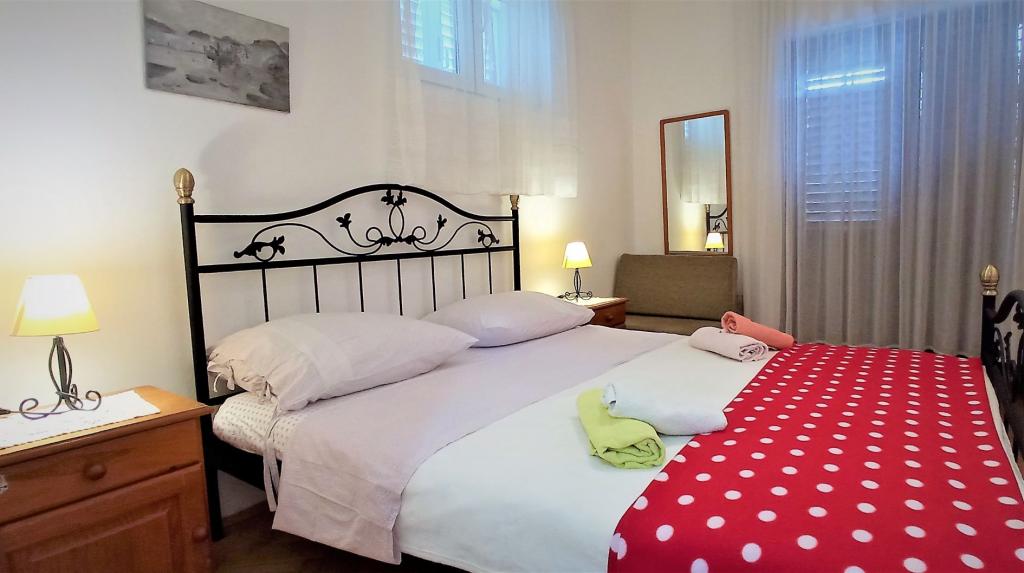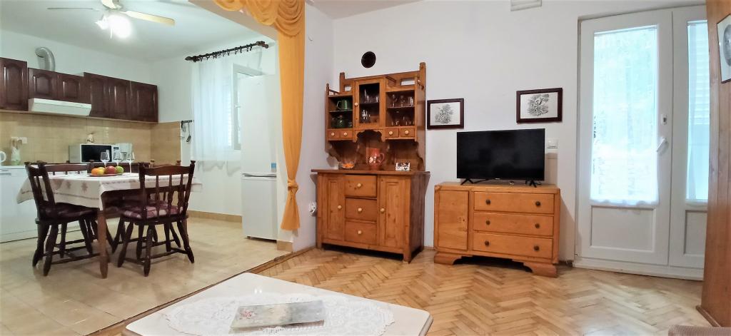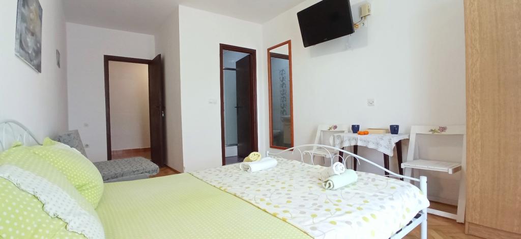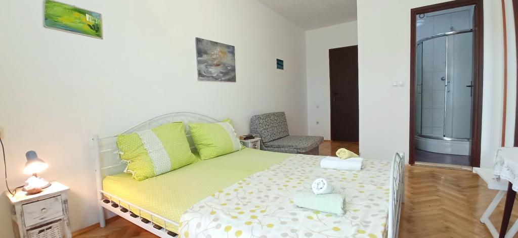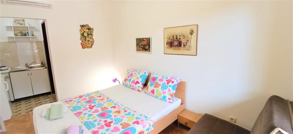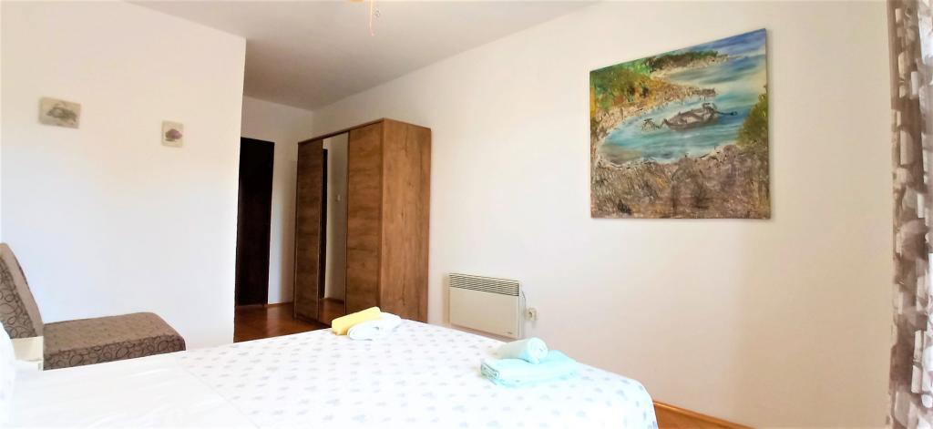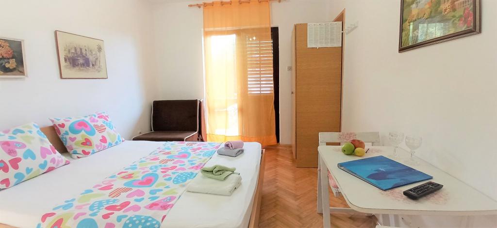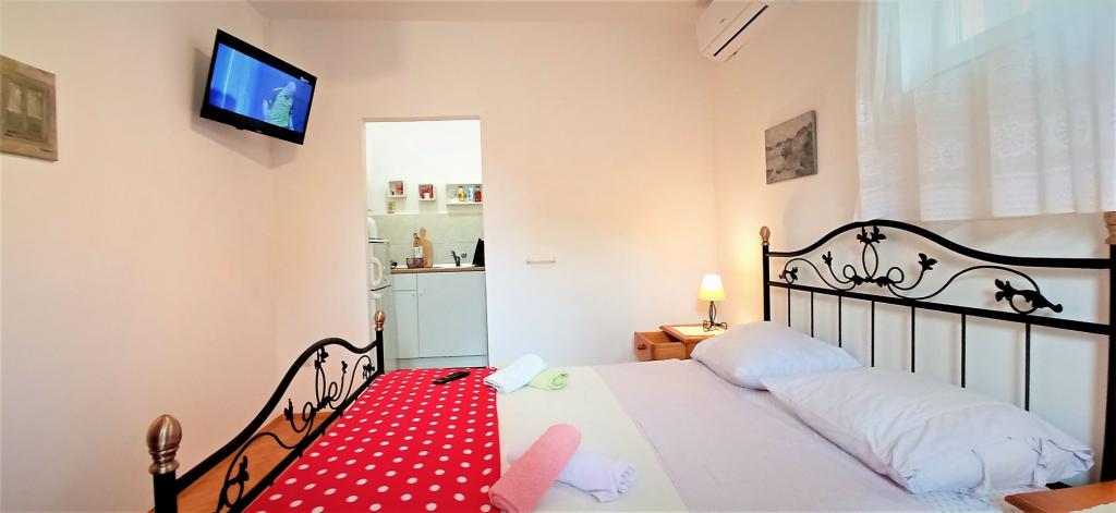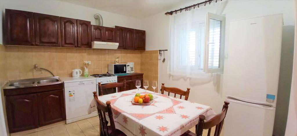70 metrů od moře. Apartmány se nacházejí mezi Jelsa a Vrboska, ostrov Hvar, na klidném místě s několika oblázkovými plážemi a jednou písečnou pláží poblíž. V našem domě nabízíme 3 studio apartmány. Každý apartmán má ložnici, koupelnu a kuchyňský kout a stůl a židle v přední části bytu vedle zahrady. Studio apartmán 3 má velkou terasu 2 pokoje. Každý z nich má vlastní WC, kuchyň a balkon se stolem a židlemi a výhledem na moře. Je také možné si pronajmout obě místnosti jako apartmán protože mají jeden společný vchod, který je oddělen od ostatních bytů VelkýApartmán -AP4 má dvě ložnice, velká kuchyň s jídelnou a obývacím pokojem, dvě koupelny. Každý pokoj má postel pro dvě osoby. Jeden z pokojů má také přistýlku a balkon s stůl a židle pro 2 osoby. Z balkonu je výhled na moře. V obývacím pokoji se nachází LCD TV a pohovka, která může být rozšířena na postel pro 2 osoby. V přední apartmánu, mezi olivový strom je terasa se stolem a židlem