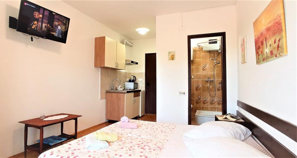 Pěkně zařízené a plně vybavené pokoje. Opravdu blízko pláže. Majitel říká, že vzdálenost k moři je 80 metrů, ale je menší