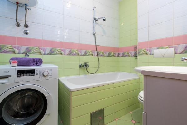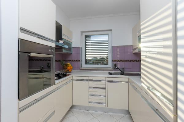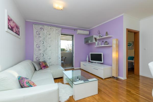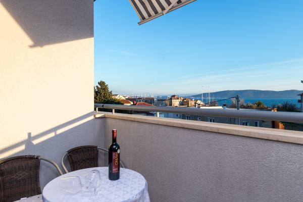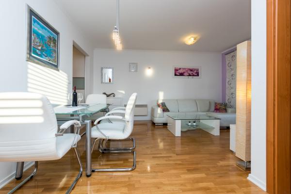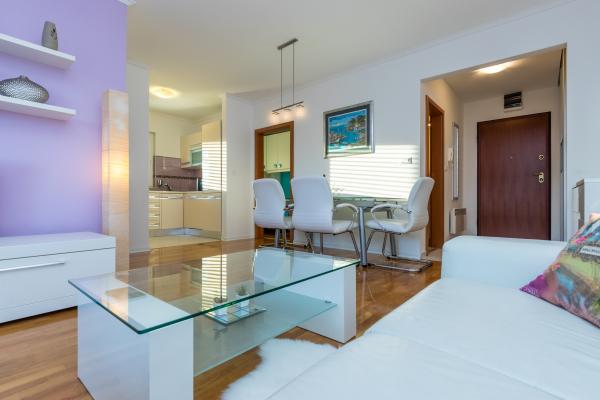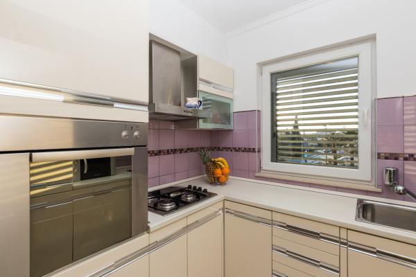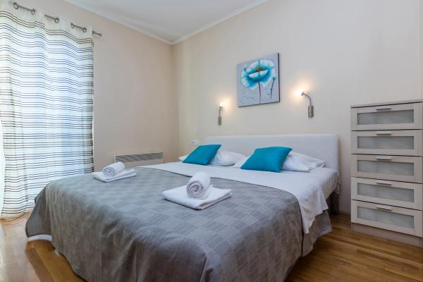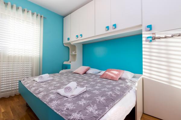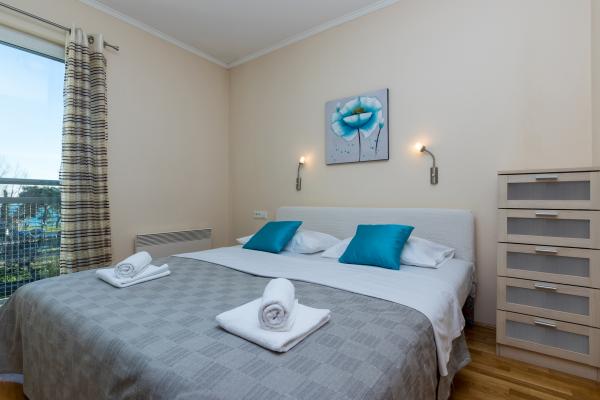 Moderně zařízený apartmán se nachází na vrcholu budovy s výhledem na moře. Byt se nachází 100 metrů od moře a pláže. V budově je supermarket, pekárna je vzdálena 2 minuty, lékárna je 3 minuty chůze. V bezprostřední blízkosti se nacházejí lékárny, restaurace a kavárny. Marina je vzdálená 10 minut chůze. Byt má dvě ložnice s manželskými postelemi, obývací pokoj s rozkládací pohovkou, kuchyň s troubou, mikrovlnnou troubou a myčkou nádobí, toaletu s pračkou, chodbu a balkon. Byt je zařazen do kategorie tří hvězdiček a je ideální pro ty, kteří chtějí mít všechno k dispozici.