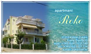 Apartmány Roko se nacházejí ve velmi klidné a příjemné lokalitě, obklopené zelení, v západní části Kaštel Lukšić. Nejbližší pláž je vzdálena pouhých 100 metrů. Každý apartmán má zajištěné parkovací místo v přírodním stínu pod baldachýnem. Ve dvoře objektu jsou prostory pro děti (trampolína, houpačky ...) a posezení, odpočinek, gril. , Všechny apartmány jsou plně vybavené nádobím, ručníky, ložním prádlem a veškerým potřebám pro dlouhodobý pobyt