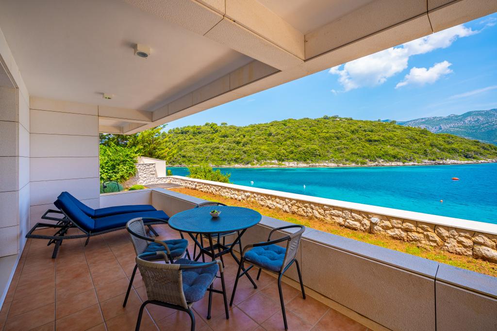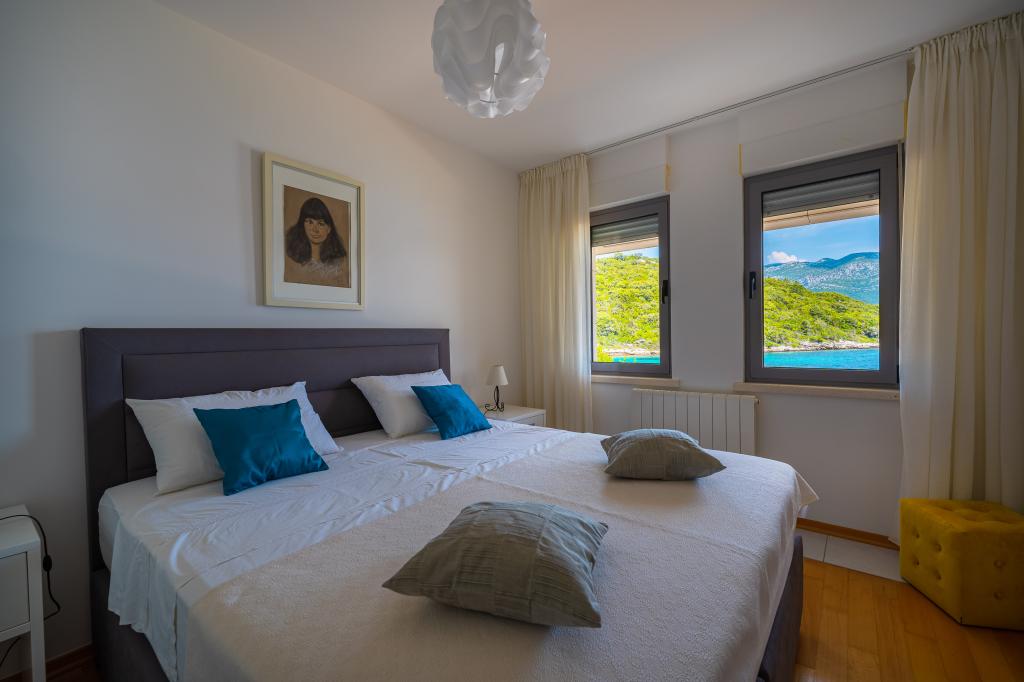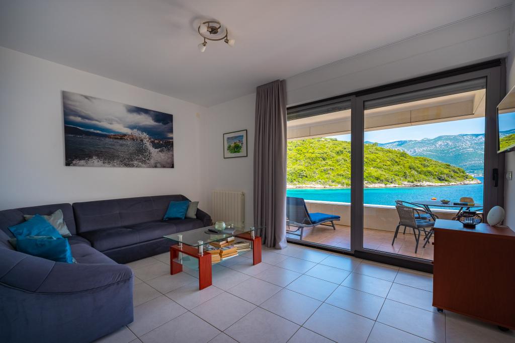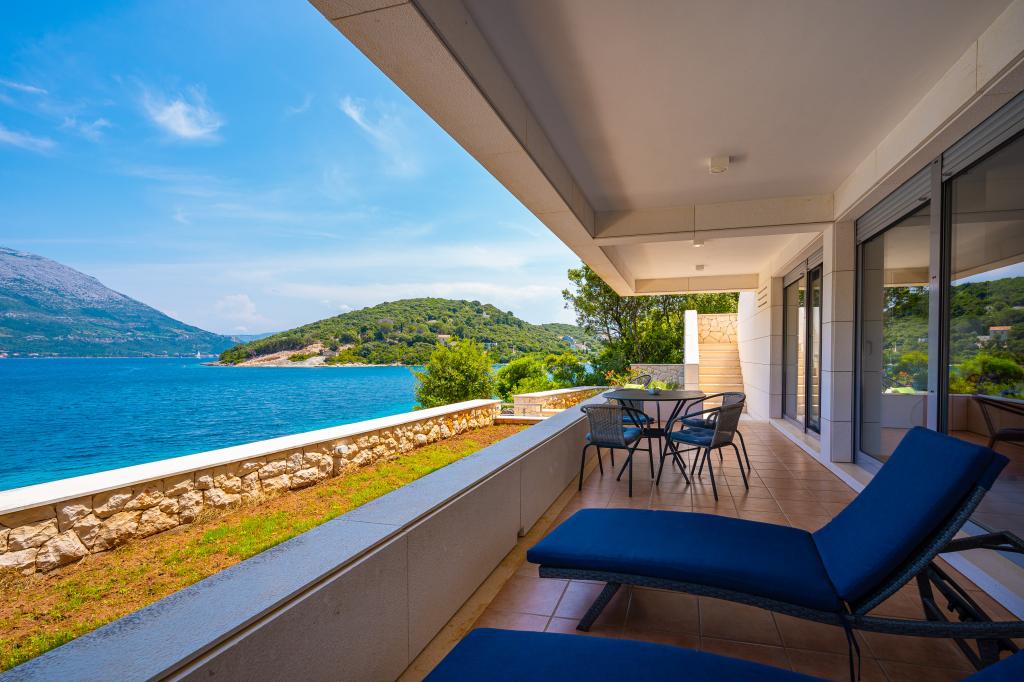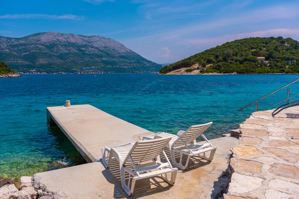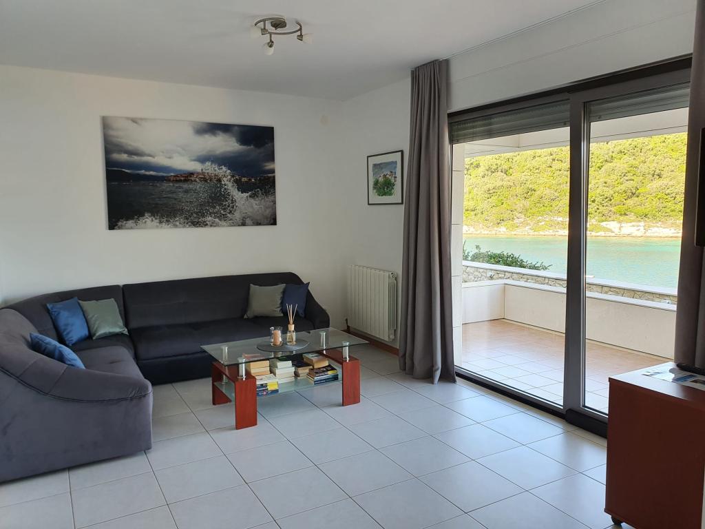 Villa Avantgarde - apartmán přímo u moře pro 4 osoby - velmi klidná zátoka - ostrov Korčula - Chorvatsko Je dílem slavného chorvatského a světově uznávaného architekta. Nachází se v klidné zátoce, cca. 4 km od centra města. Ve vile máte k dispozici pohodlný apartmán o velikosti cca. 100 m2, který se skládá ze 2 ložnic, koupelny a obývacího pokoje s dobře vybavenou kuchyní, jídelnou a obývacím pokojem, ze kterého je vstup na prostornou terasu s přímým vstupem na soukromou pláž. Pláž je 9 m od apartmánu. Ve vile je k pronájmu pouze jeden byt. Obklopují ho upravené trávníky, zeleň, ptačí zpěv a moře. Hostům je k dispozici uzavřené soukromé parkoviště. Ložnice, obývací pokoj, jídelna a terasa jsou orientovány přímo na moře. Lze jej využívat po celý rok, jelikož je vybaven ústředním topením.