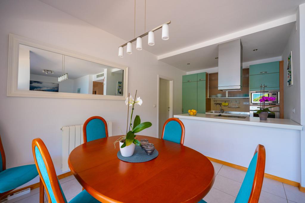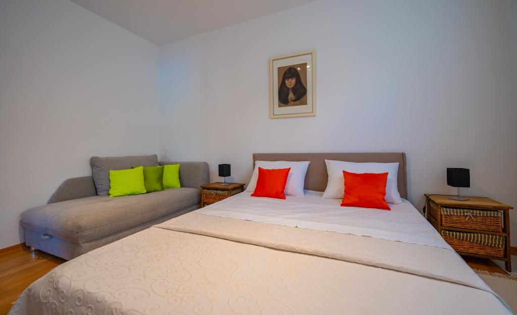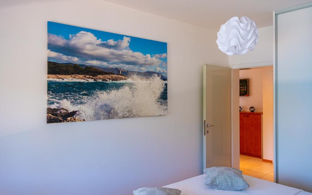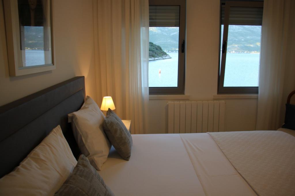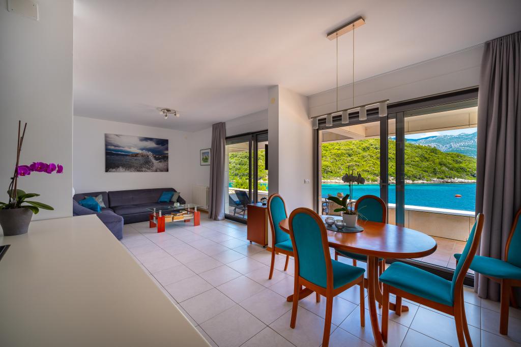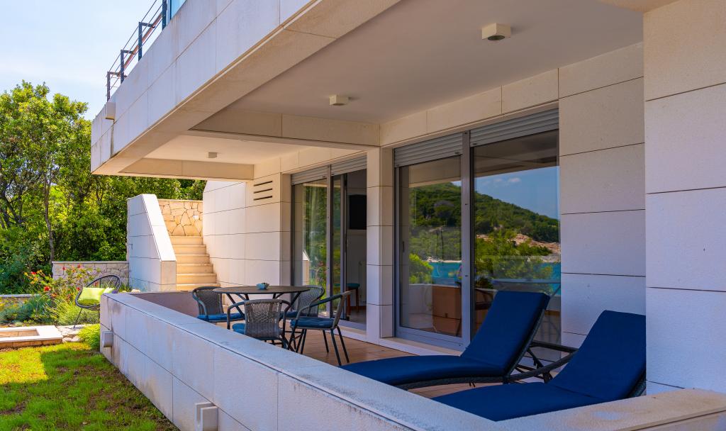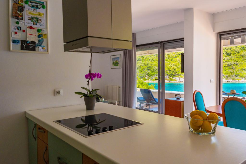 Villa Avantgarde - apartmán přímo u moře pro 4 osoby - velmi klidná zátoka - ostrov Korčula - Chorvatsko Je dílem slavného chorvatského a světově uznávaného architekta. Nachází se v klidné zátoce, cca. 4 km od centra města. Ve vile máte k dispozici pohodlný apartmán o velikosti cca. 100 m2, který se skládá ze 2 ložnic, koupelny a obývacího pokoje s dobře vybavenou kuchyní, jídelnou a obývacím pokojem, ze kterého je vstup na prostornou terasu s přímým vstupem na soukromou pláž. Pláž je 9 m od apartmánu. Ve vile je k pronájmu pouze jeden byt. Obklopují ho upravené trávníky, zeleň, ptačí zpěv a moře. Hostům je k dispozici uzavřené soukromé parkoviště. Ložnice, obývací pokoj, jídelna a terasa jsou orientovány přímo na moře. Lze jej využívat po celý rok, jelikož je vybaven ústředním topením.