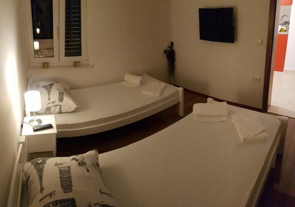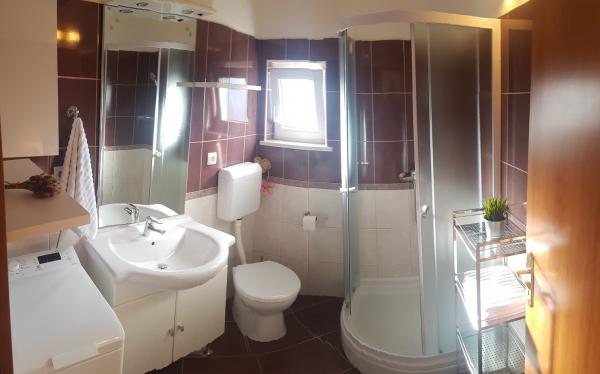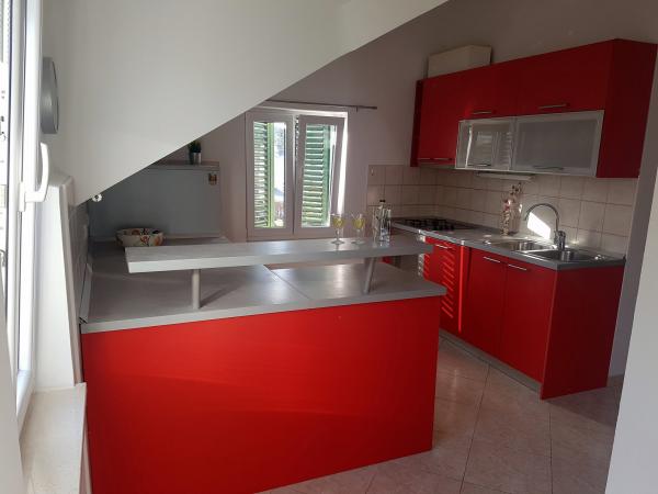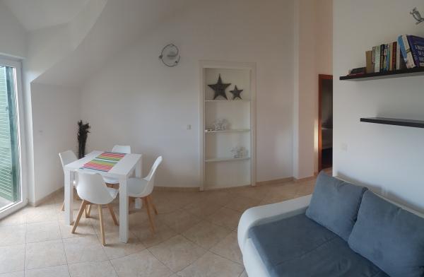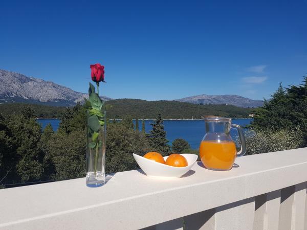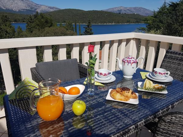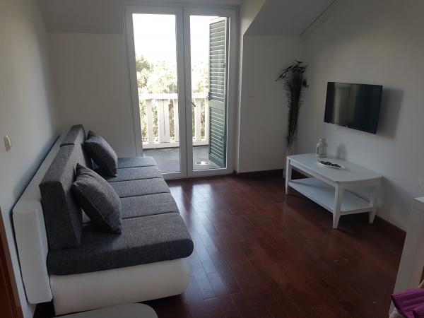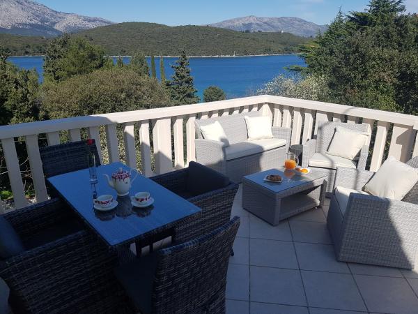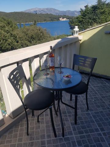 Prostorný apartmán, který se nachází v podkroví rodinného domu. S vlastním balkonem s výhledem na moře, má také velkou terasu, která je vyzdobena pro odpolední odpočinek. Objekt se nachází 40 metrů od moře, 600 metrů od nákupního centra a 3 km od centra Korčuly. Dům je obklopen borovými lesy, velmi klidná postava ideální pro dovolenou.