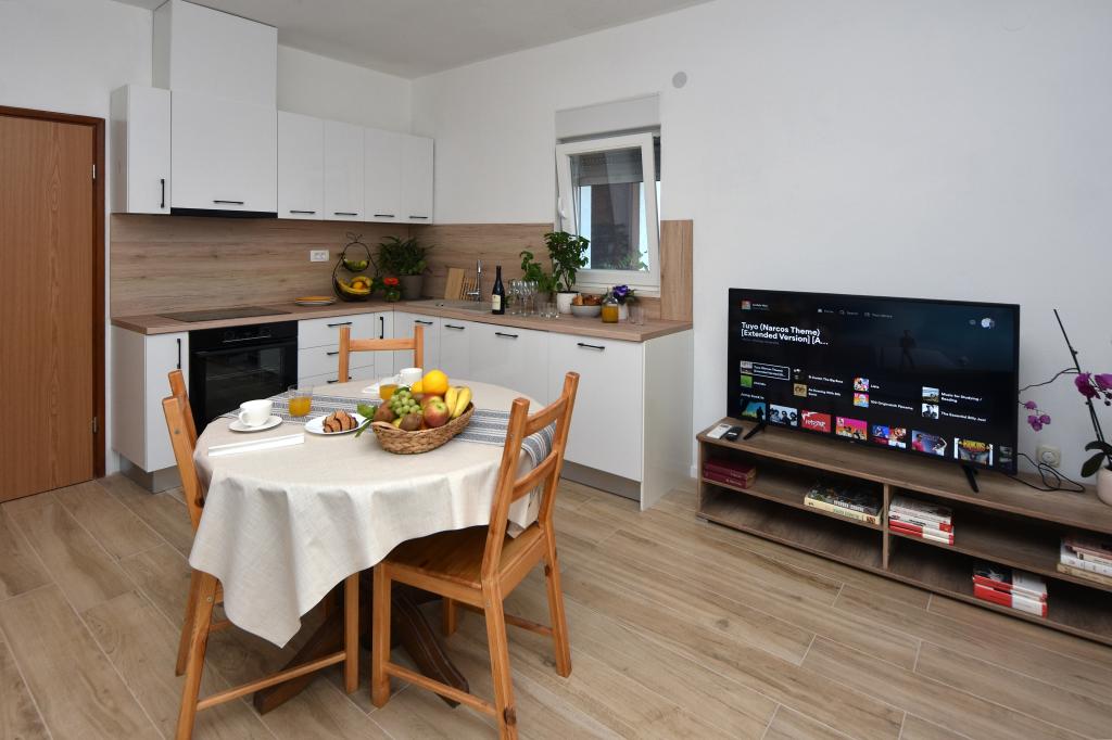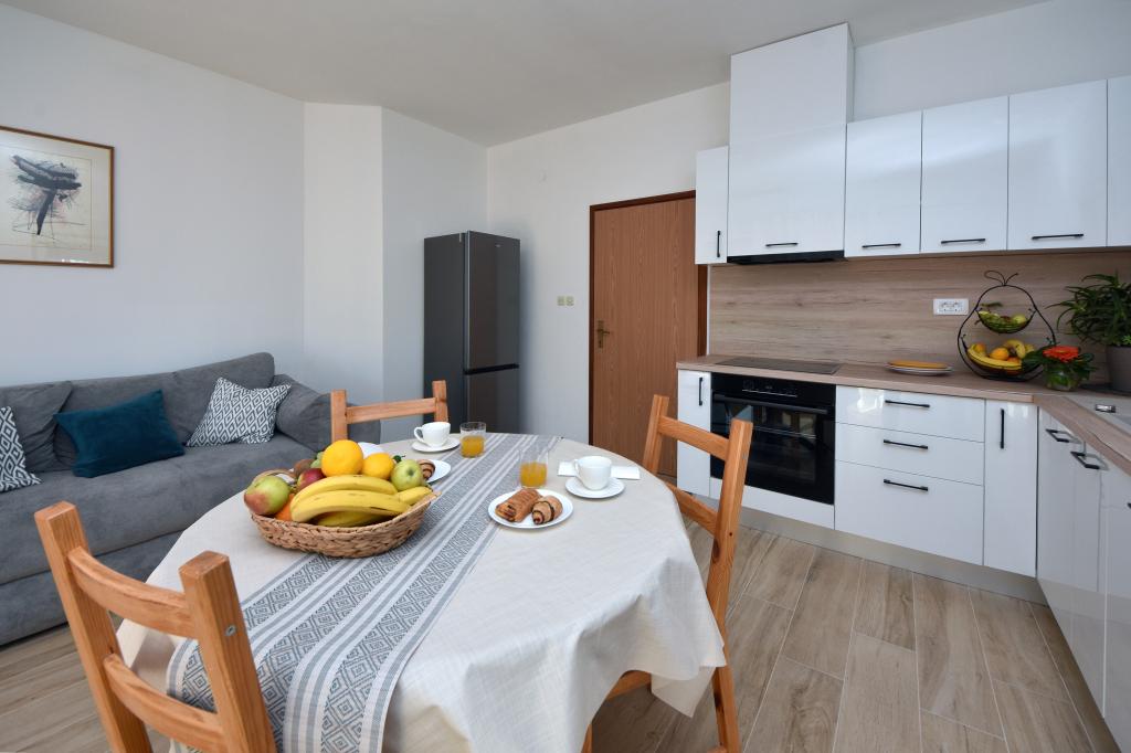Byt se nachází v rodinném domě, který je obklopen olivovníky, květinami a cvrlikáním ptáků. Host má naprosté soukromí, protože před domem ani vedle něj nejsou žádné budovy. Pokud chcete klidný kout, je to ideální místo k odpočinku V blízkosti domu se nachází autobusové nádraží, restaurace, lékárna, dětské hřiště a pláž je vzdálená 700 metrů. Autem to na pláž trvá 2-3 minuty a pěšky asi 10 minut.