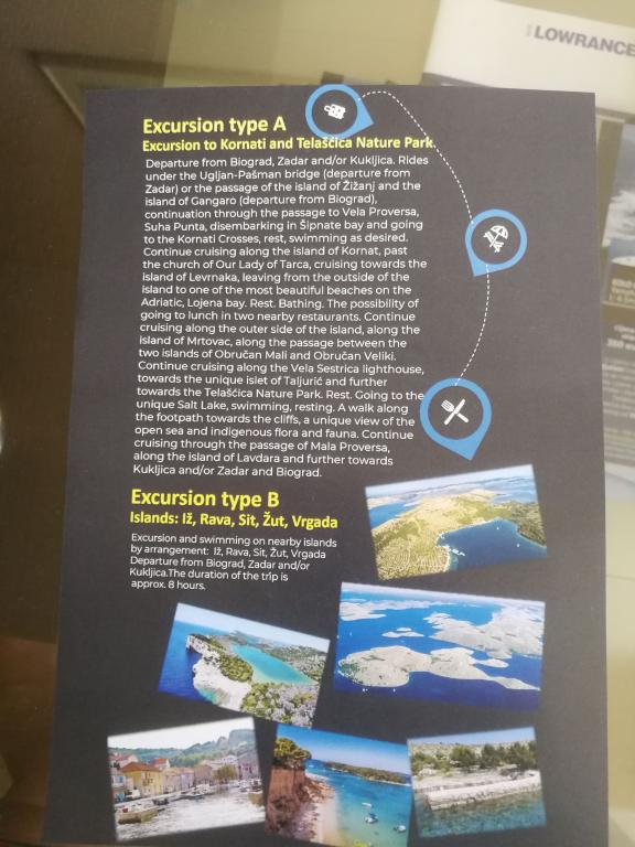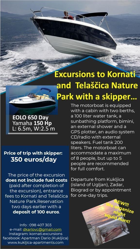 Hostitel nabízí mnoho aktivit, doplňkového obsahu a zábavy, včetně výletů do blízkých zátok (písečná pláž Sabuša, Kostanj), na ostrovy souostroví Zadar, Kornati, přírodní park Telašćica, se zkušeným kapitánem a motorovým člunem typu EOLO 650, motor Yamaha 150 pro 6 osob. Po dohodě s kapitánem je možné zorganizovat půldenní nebo jednodenní výlet (koupání, potápění nebo poznávání). Pokud hosté chtějí pohodlnou a rychlou dopravu do Zadaru za 10 minut na večerní výlet nebo nákupy, je to také možné po předchozím upozornění. Kromě toho se hostům nabízí možnost uspořádat denní a noční lov chobotnic, což je zvláštní potěšení a jedinečný zážitek. Zvláštní přitažlivost rybaření oštěpy tradičním dalmatským způsobem v noci pod umělým světlem vás nenechá lhostejnými. Povolení k rybolovu lze získat od rybářského sdružení Kukljica. Hostitel také nabízí půjčovnu dřevěných kánoí a veslování na krásnou písečnou pláž Kostanj v nedaleké zátoce.