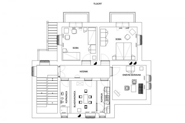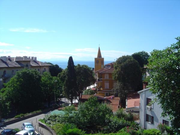 Apartmán s výhledem na moře se nachází v prvním patře secesní vily v klidné části letoviska Lovran. Od vchodu do atria do chodby, která rozděluje prostor na jižní a severní části a na jejím konci je obývací pokoj. V jižní části jsou dvě ložnice, každá s balkonem. V severní části kuchyní, jídelnou a koupelnou. Dvě dětské postýlky jsou k dispozici na vyžádání. Na zahradě je zahradní nábytek a gril. Byt má výhled na moře, Great Neck, Cres, Krk a Rijeka na jedné straně, a na druhé straně na svazích Učka. Byt se nachází pouhých 150 metrů od pláže CIPER děti a malé skalnaté pláže, 800 m od pláže a 2,5 km od přírodních písečných pláží v Medveja. Pobřežní chodník 7 km dlouhá spojující Lovran a Ika, Ičići Opatija a Voloskom.Za ty, kteří mají rádi pěší turistiku, dlouhé procházky na stinných svazích, jízda na kole nebo na koni v dobře udržované stezky přes hluboké lesy jen 1,5 km od apartmánu Park Přírodní park.