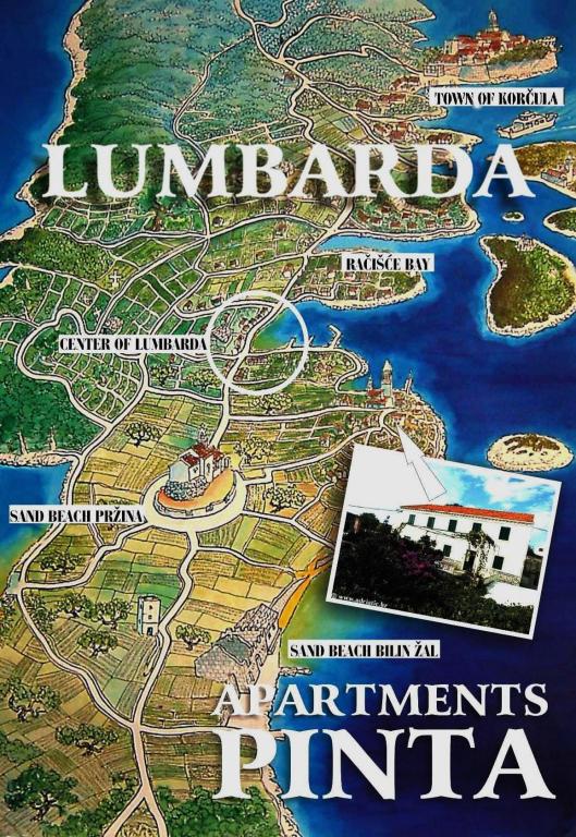 Apartmány Pinta se nacházejí ve staré a klidné části městečka Lumbarda na ostrově Korčula. Jsou 5-10 minut chůze od písečných pláží Bilin žal a Pržina a 10 minut od centra Lumbardy. Naše rodina má dlouhou tradici dělat cestovatele šťastnými. V roce 1928 naši předkové otevřeli první penzion v Lumbardě pod názvem PINTA. V 80. letech 20. století byl dům přestavěn na byty a v roce 2012 byl dům kompletně zrekonstruován, čímž vynikla krása staré zástavby. Dostupné kapacity a velké terasy svým propojením v jednom domě představují možnost společné dovolené pro větší skupinu hostů, kteří mají zároveň v každém apartmánu svůj komfort. K dispozici: Apartmány pro dva - se nachází v prvním patře (s velkou terasou), Apartmán pro pět - přízemí a první patro domu (terasa a balkon); Apartmán pro čtyři - v prvním patře s vlastním velkým balkonem.