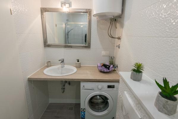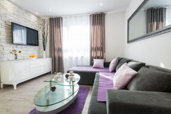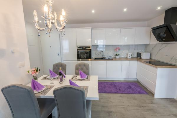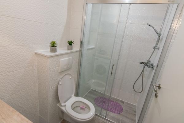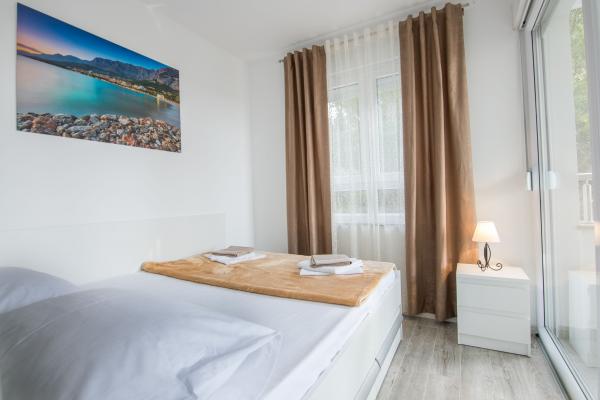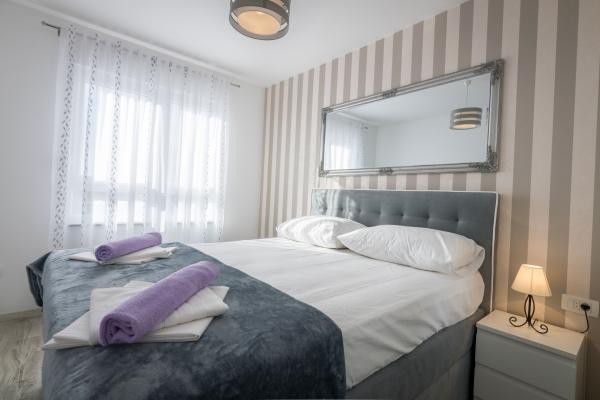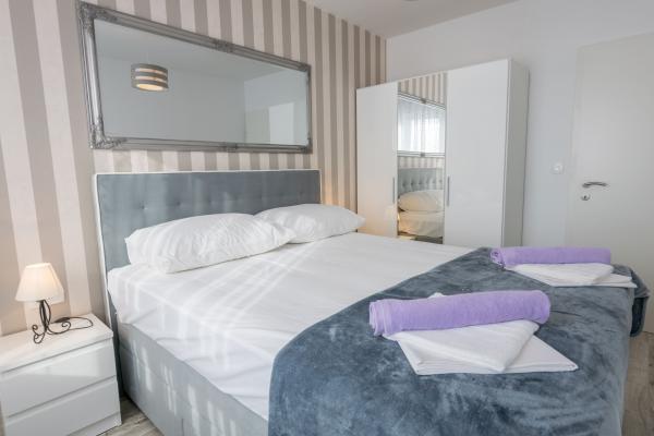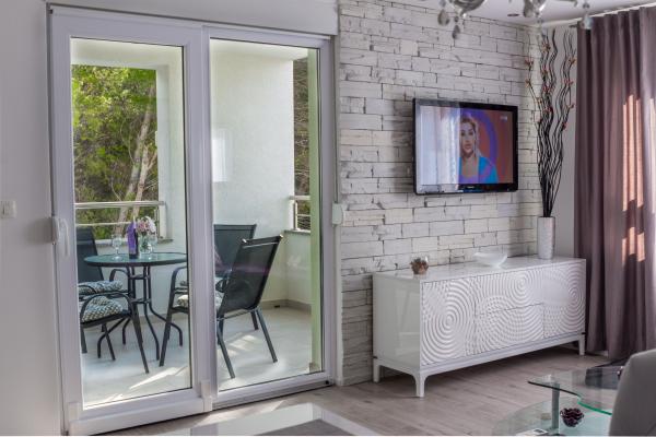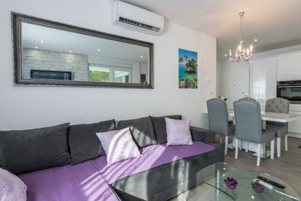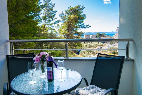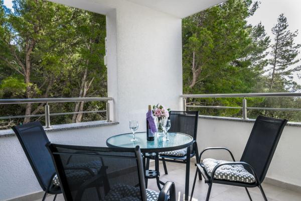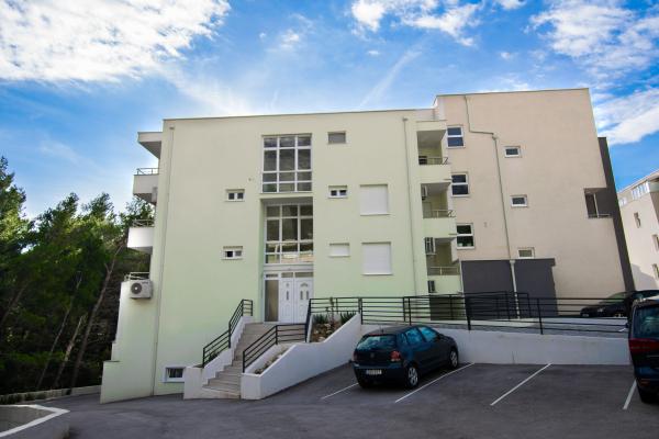 Plně a moderně vybavený nový apartmán, s výhledem na moře, velikost 60 m2. Byt se skládá ze dvou ložnic s velkými postelemi, koupelna, kuchyň, terasa. Je vybaven klimatizací, WI-FI internetem a má vlastní parkoviště, které je pro hosty zdarma. Byt se nachází v klidném prostředí u borového lesa a je izolován od hluku aut. Daleko od pláže, moře cca 650-700 metrů, 5-6 minut pěšky, od autobusového nádraží také cca 600-700 metrů, od centra cca 900 metrů.