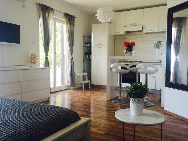 Krásné nově zrekonstruované byty v okrajové části města Makarska, Velké Hill, který se nachází na svazích horského svahu, západně od města. Apartmány mají velkou manželskou postelí, kuchyň a jídelna a samostatnou koupelnu. Hosté také mohou užívat i stolovat na prostorné terase. Apartmány se nacházejí v luxusním letovisku makaraskog pobřeží, hosté ji často nazývají oázou klidu a pohody, a je ideální pro všechny milovníky adrenalinových sportů, cyklistiky a parašutismu. Jsme jen 6 minut jízdy autem od ruchu města, restaurací a nočního života. Všichni hosté obdrží zdarma WiFi připojení k internetu a bezplatné parkoviště s předchozí rezervaci. Všechny namjještaj je zcela nový s ohledem na byty renovovaný v létě 2015. Každý apartmán je vybaven LCD televizí a zbrusu nový kuchyňské spotřebiče. Jsme ideální volbou pro lidi, kteří opravdu ocení vaši dovolenou, klidný spánek, čistý horský vzduch, krásné písečné pláže Makarské riviéře.