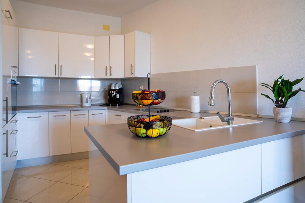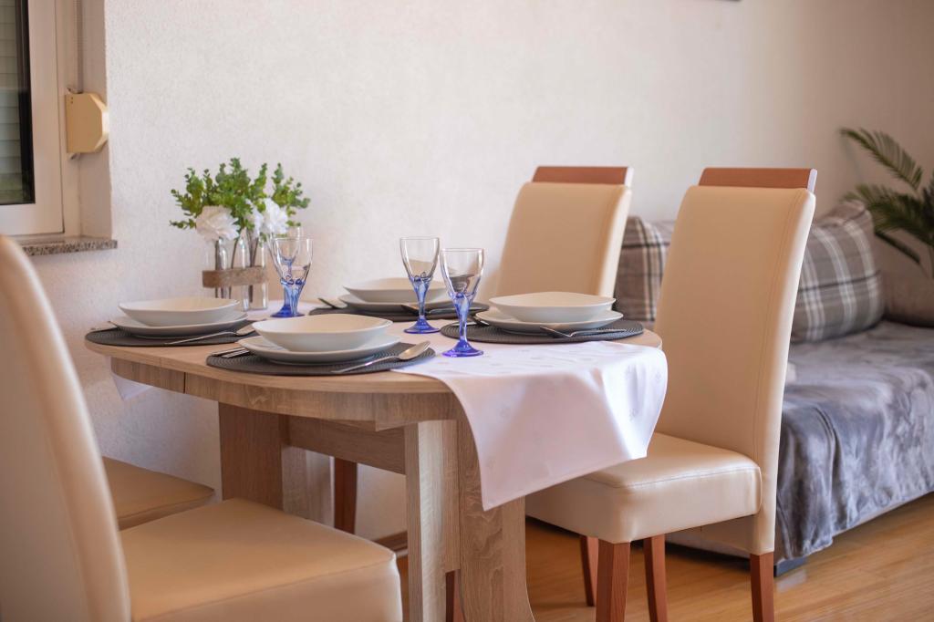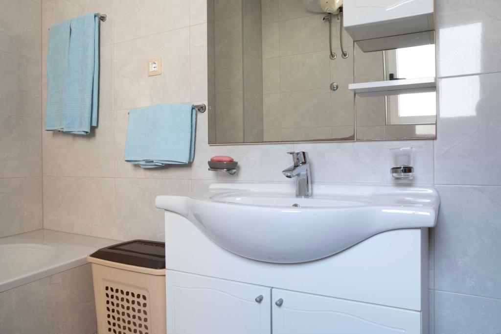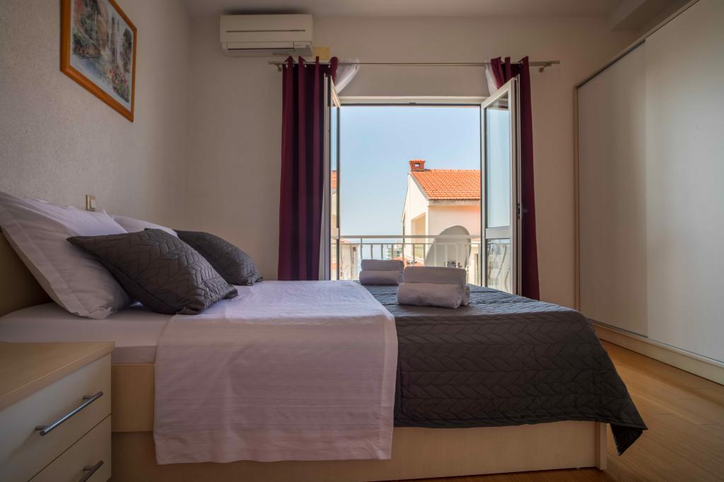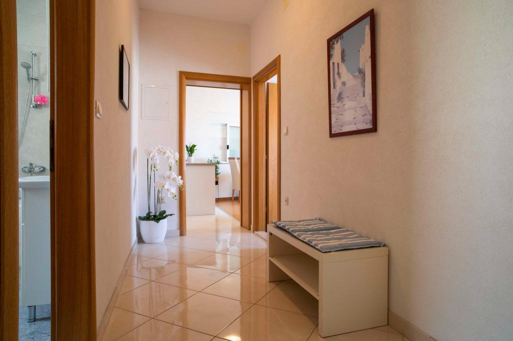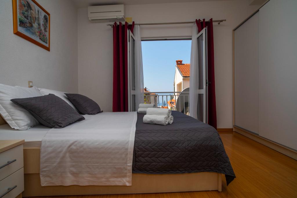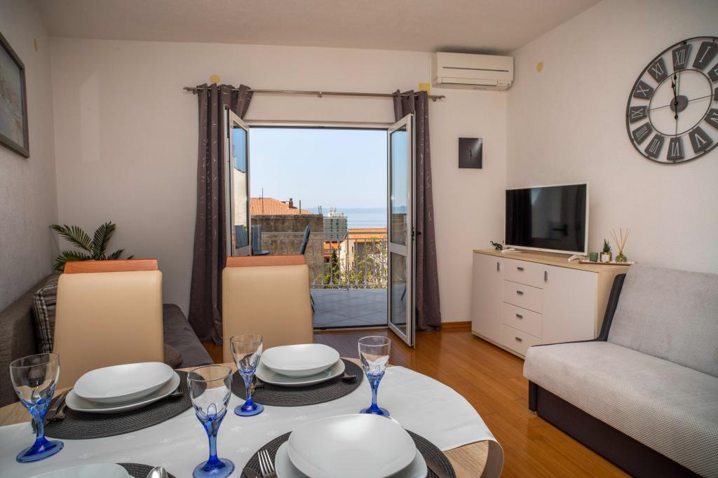 Vítejte v apartmánu "Ivana" s výhledem na moře a garáží. Ideální pro 2 dospělé a 4 děti. Skládá se z ložnice, koupelny, obývacího pokoje se 2 rozkládacími pohovkami a plně vybavené kuchyně. V obývacím pokoji a ložnici jsou klimatizace.
