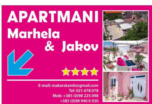 NOVINKA !!! Byty Marheim a Jacob se nachází v historickém centru města Makarska, v blízkosti nábřeží, náměstí, Co-Cathedral of St. Mark a různé bary a restaurace. Hosté mají přístup k ubytování v klimatizovaných pokojích, společná zařízená terasa (180 m2) s lehátky a slunečníky a bezplatné Wi-Fi. Všechny apartmány jsou vybaveny pohovkou, TV s plochou obrazovkou se satelitním příjmem a plně vybavenou kuchyň s jídelním stolem. To také má vlastní koupelnu se sprchovým koutem, fénem a ručníky. Nejbližší obchod potraviny, restaurace a prádelny má 10 metrů. Pláž se nachází 100 metrů od hotelu a autobusová zastávka 300 m od apartmánu Marheim a Jacob. Uvnitř budovy je k dispozici bezplatné parkoviště vnitřní 4 parkovací stání (100 m2) a 2 parkovací místa mimo. .Usluga Dopravu z / na letiště je k dispozici za příplatek na vyžádání. Máme otevřeno po celý rok. ,