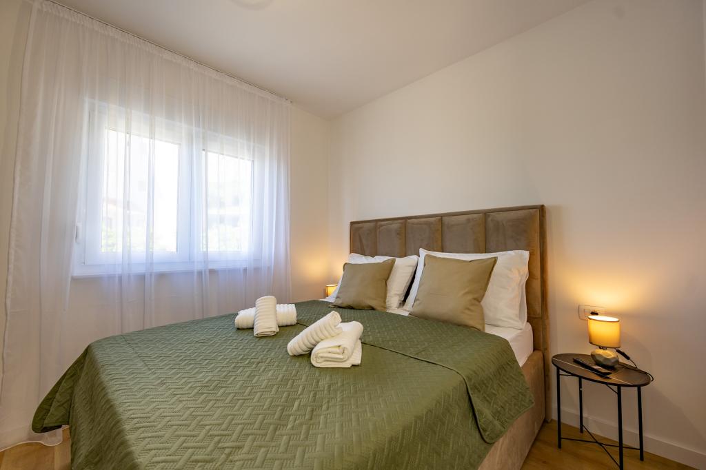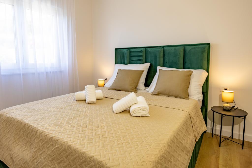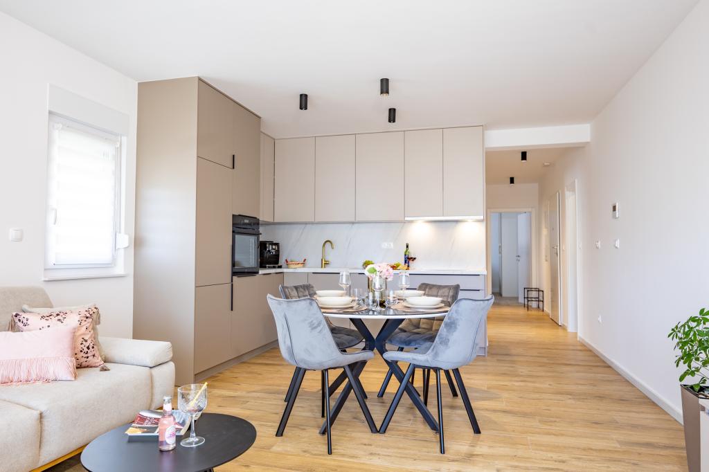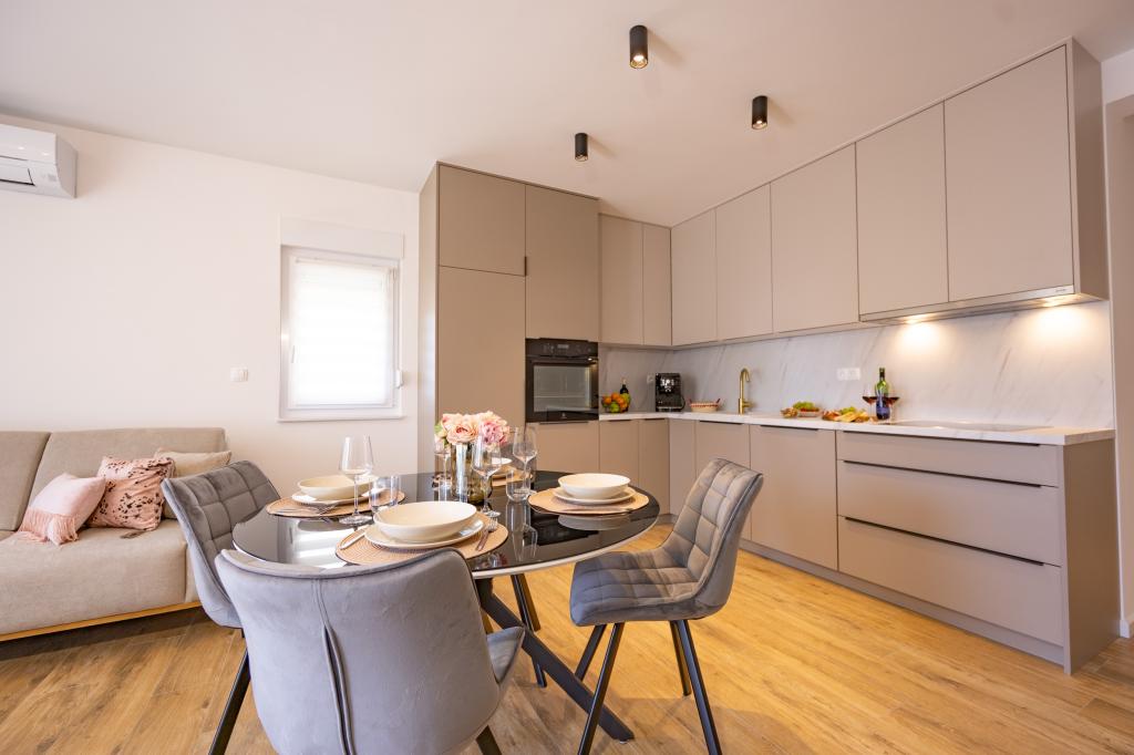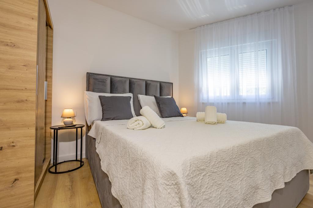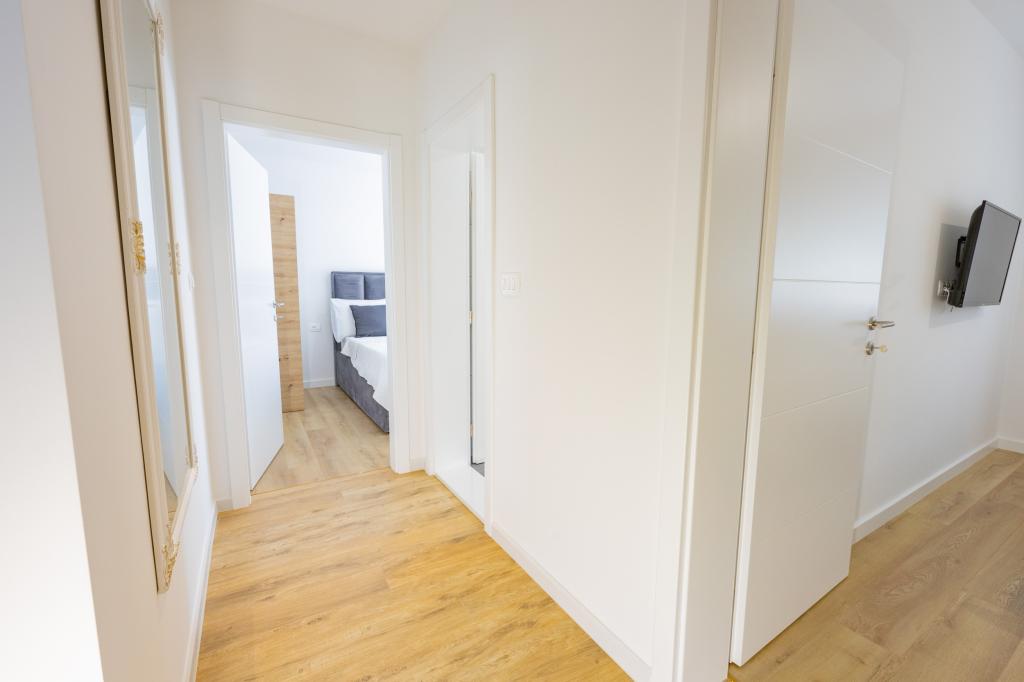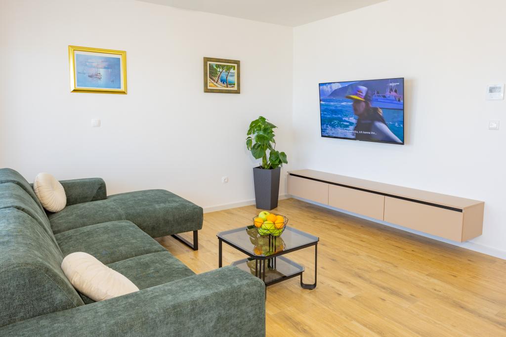 Každý apartmán vyzařuje moderní design a nově zrekonstruovaný interiér. V prostorném obývacím pokoji, zařízeném vkusným nábytkem a moderními detaily, se budete cítit jako doma. Otevřený koncept přirozeně propojuje obývací pokoj s plně vybavenou kuchyní, kde na vás čekají elegantní pracovní desky, kvalitní spotřebiče a veškerý prostor potřebný k přípravě vašich oblíbených jídel. Obývací část se otevírá na příjemný balkon - ideální místo pro ranní kávu nebo večerní relaxaci se sklenkou vína a nezapomenutelným západem slunce nad Jadranem. Každý apartmán má dvě pohodlné ložnice s manželskými postelemi, vybavené měkkým ložním prádlem a dostatkem úložného prostoru, jednu moderní koupelnu a další toaletu. Apartmány jsou klimatizované a plně vybavené: TV/SAT, internet, pračka, myčka nádobí, kávovar a vše, co potřebujete pro příjemný a bezstarostný pobyt.
