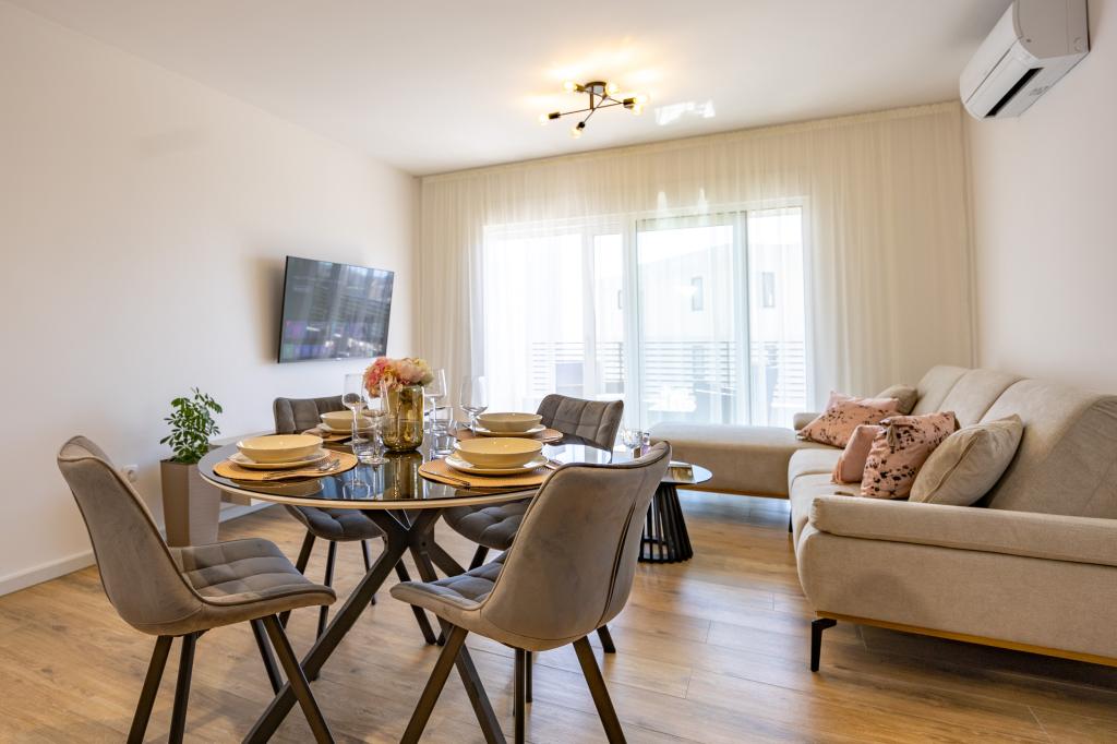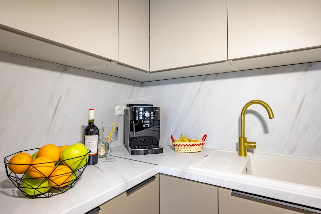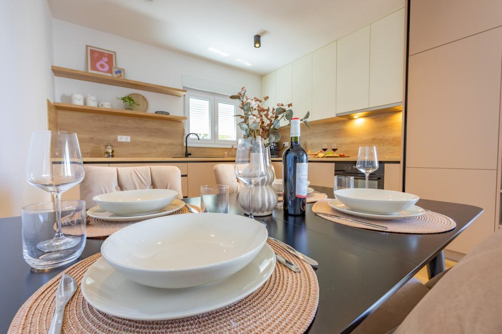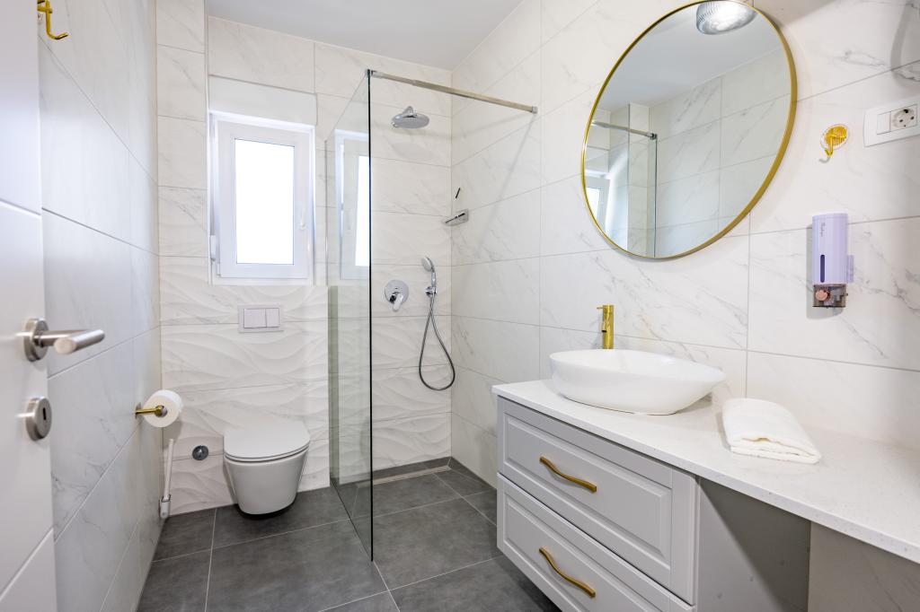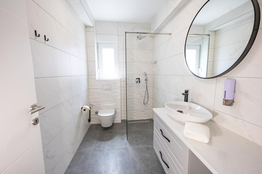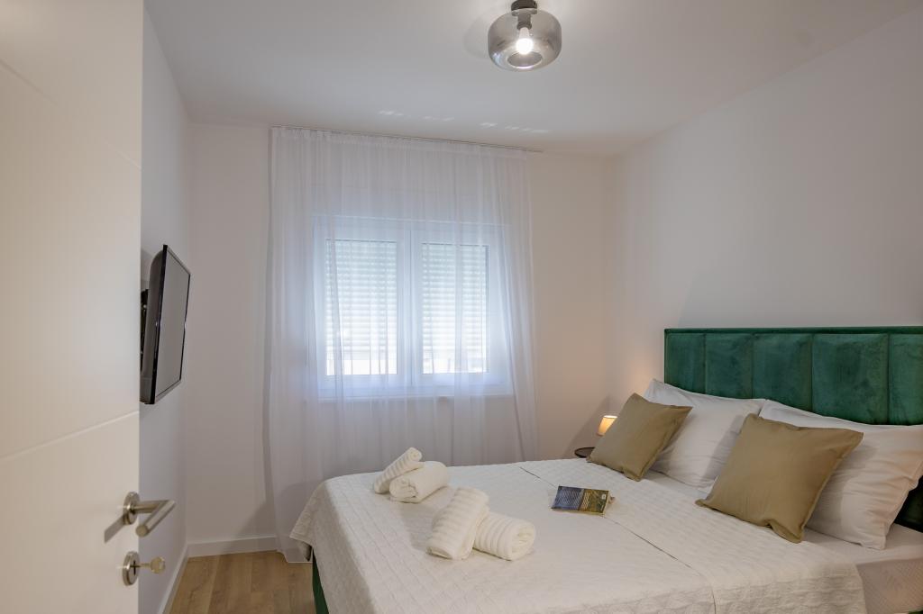 Každý apartmán vyzařuje moderní design a nově zrekonstruovaný interiér. V prostorném obývacím pokoji, zařízeném vkusným nábytkem a moderními detaily, se budete cítit jako doma. Otevřený koncept přirozeně propojuje obývací pokoj s plně vybavenou kuchyní, kde na vás čekají elegantní pracovní desky, kvalitní spotřebiče a veškerý prostor potřebný k přípravě vašich oblíbených jídel. Obývací část se otevírá na příjemný balkon - ideální místo pro ranní kávu nebo večerní relaxaci se sklenkou vína a nezapomenutelným západem slunce nad Jadranem. Každý apartmán má dvě pohodlné ložnice s manželskými postelemi, vybavené měkkým ložním prádlem a dostatkem úložného prostoru, jednu moderní koupelnu a další toaletu. Apartmány jsou klimatizované a plně vybavené: TV/SAT, internet, pračka, myčka nádobí, kávovar a vše, co potřebujete pro příjemný a bezstarostný pobyt.