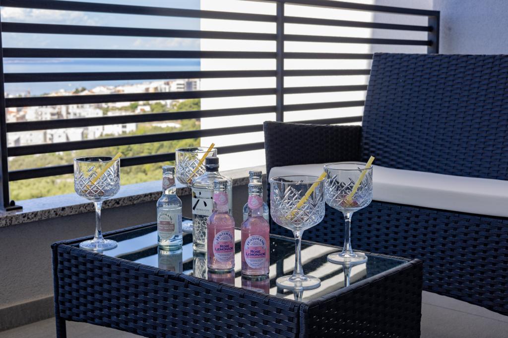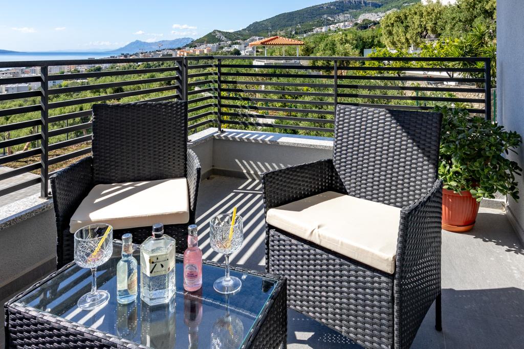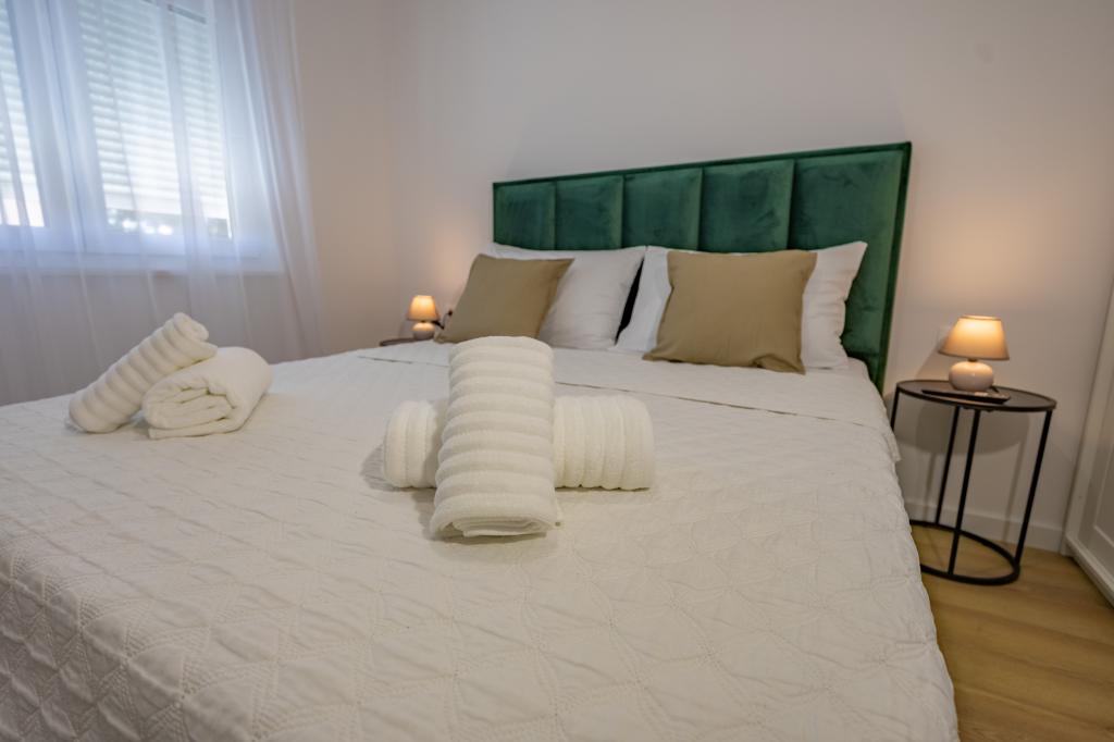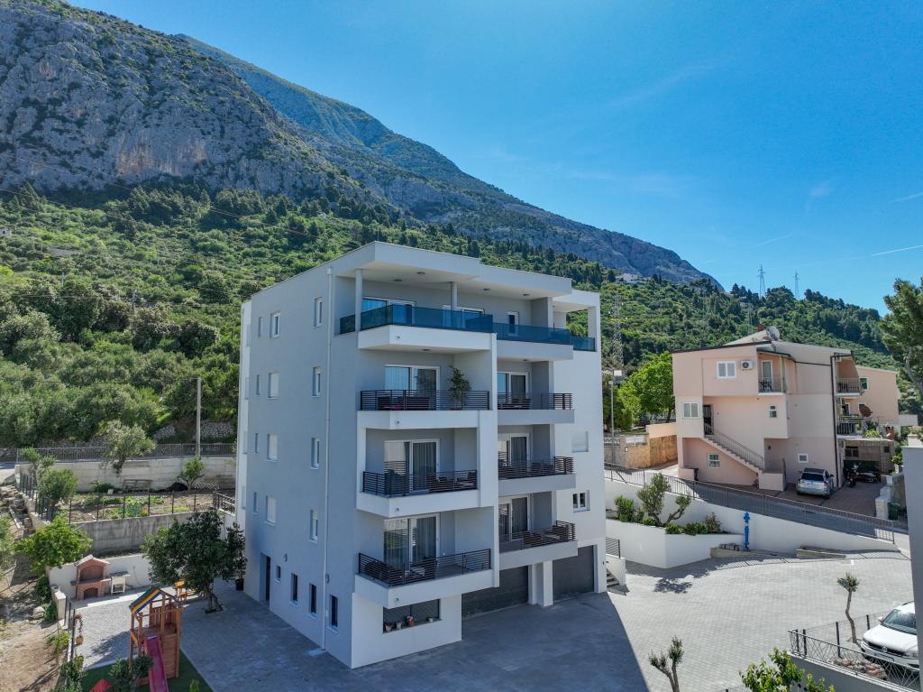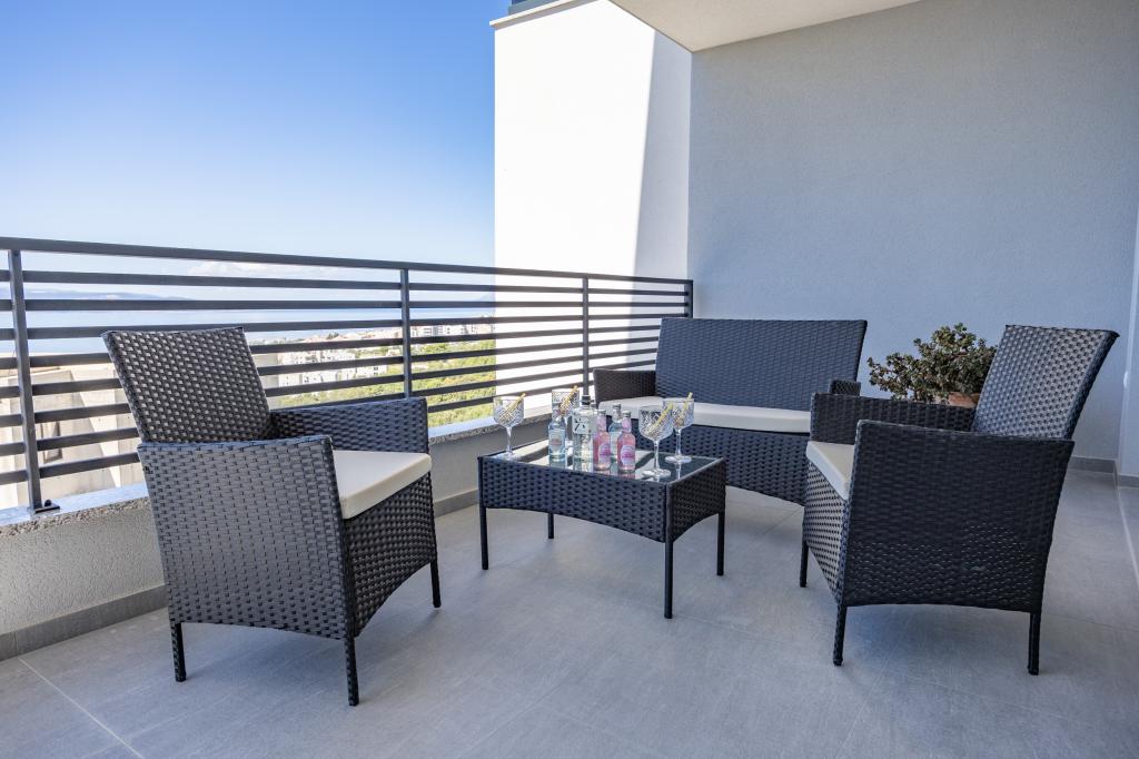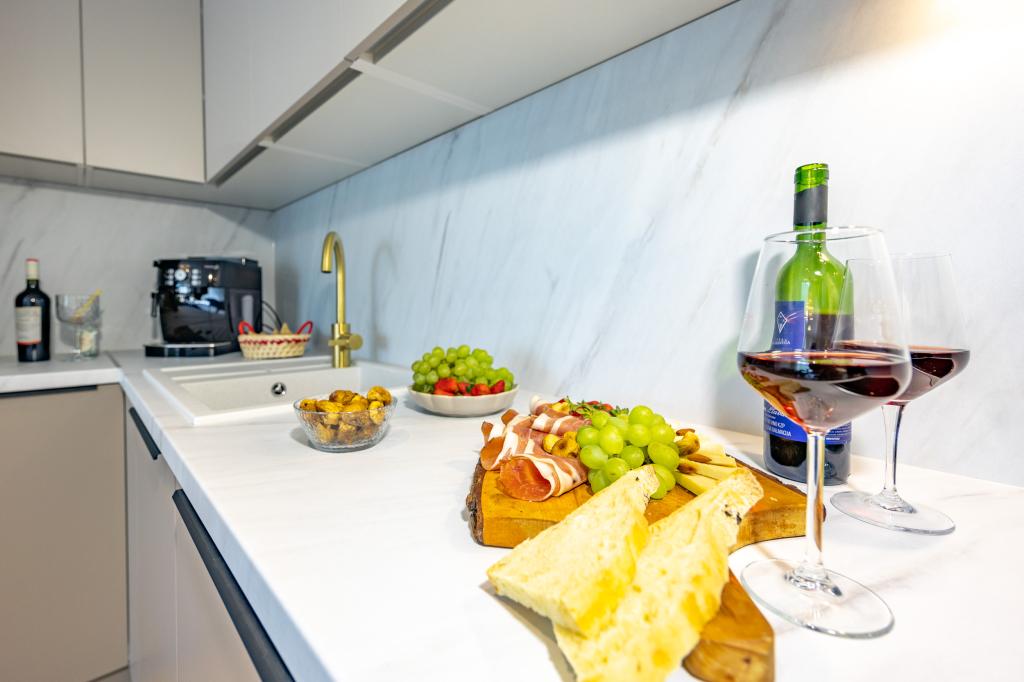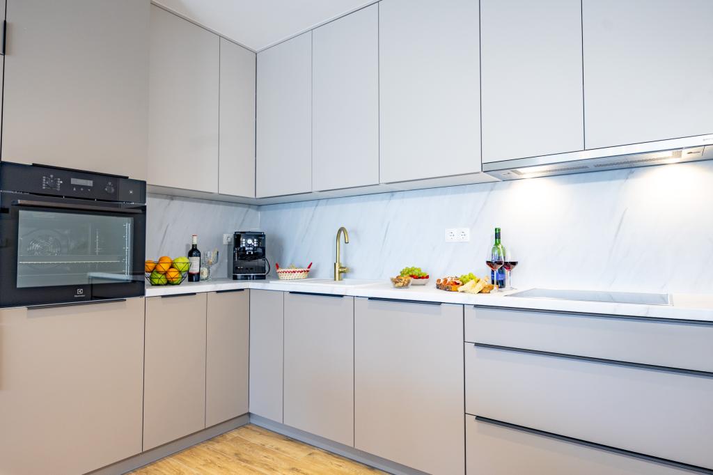 Každý apartmán vyzařuje moderní design a nově zrekonstruovaný interiér. V prostorném obývacím pokoji, zařízeném vkusným nábytkem a moderními detaily, se budete cítit jako doma. Otevřený koncept přirozeně propojuje obývací pokoj s plně vybavenou kuchyní, kde na vás čekají elegantní pracovní desky, kvalitní spotřebiče a veškerý prostor potřebný k přípravě vašich oblíbených jídel. Obývací část se otevírá na příjemný balkon - ideální místo pro ranní kávu nebo večerní relaxaci se sklenkou vína a nezapomenutelným západem slunce nad Jadranem. Každý apartmán má dvě pohodlné ložnice s manželskými postelemi, vybavené měkkým ložním prádlem a dostatkem úložného prostoru, jednu moderní koupelnu a další toaletu. Apartmány jsou klimatizované a plně vybavené: TV/SAT, internet, pračka, myčka nádobí, kávovar a vše, co potřebujete pro příjemný a bezstarostný pobyt.