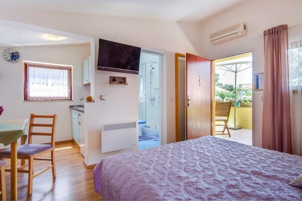 Plně vybavený apartmán Arty, kategorizovaný 4 hvězdičkami, je určen výhradně pro ubytování 2 osob. Jedná se o samostatné zařízení vedle domu, kde bydlí hostitelé. Nachází se v klidné oblasti v blízkosti několika pláží a je ideální pro dovolenou. Je to jen pár minut od nejbližších pláží a o něco dále je několik dalších krásných pláží. Do apartmánu je možné vzít si domácího mazlíčka za příplatek 10 eur. V ceně je zahrnut welcome drink. Kromě vybavené kuchyně, jídelny, ložnice a koupelny má apartmán také vlastní parkoviště, místo pro kola, gril pouze pro hosty, WI-FI internet zdarma, klimatizace, topení, TV, satelit, ... V kuchyni dostane každý host : novou houbu a prostředek na mytí nádobí, kuchyňské utěrky, . .V kuchyni dále: toustovač, kávovar, varná konvice, stojanový mixér,... Přejeme Vám srdečné přijetí a příjemnou dovolenou v našem apartmánu!