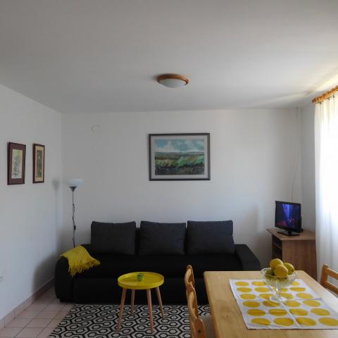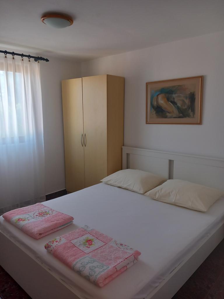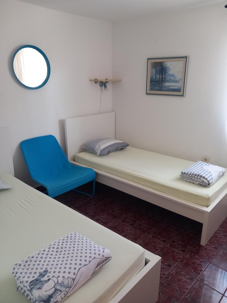 Apartmán v klidné části Malinska, 800 m od pláže, v prvním patře se 2 ložnicemi, obývacím pokojem propojeným s kuchyní, koupelnou, balkonem se stolem a 4 židlemi, zahradním nábytkem, grilem, parkováním. Vybavení: Klimatizace, Satelitní TV, lednice s mrazákem, elektrický sporák (čtyři hořáky a trouba), kávovar na filtraci kávy, kapslový kávovar, toustovač, mixér, kompletní kuchyňské náčiní, mini linka (rádio, CD), ručníky (2 na osobu), ložní prádlo