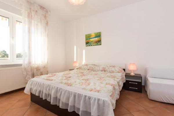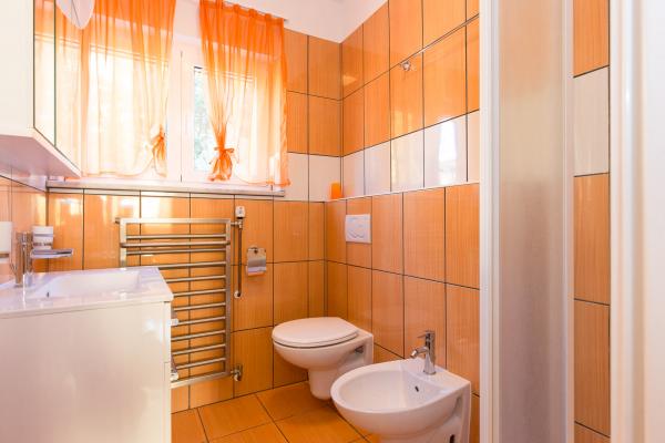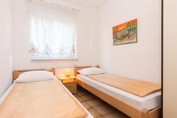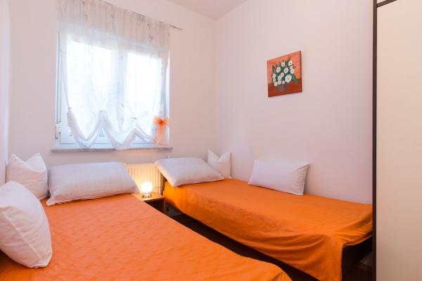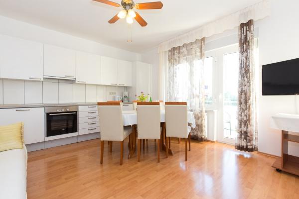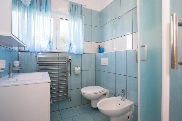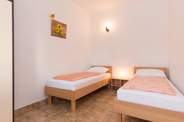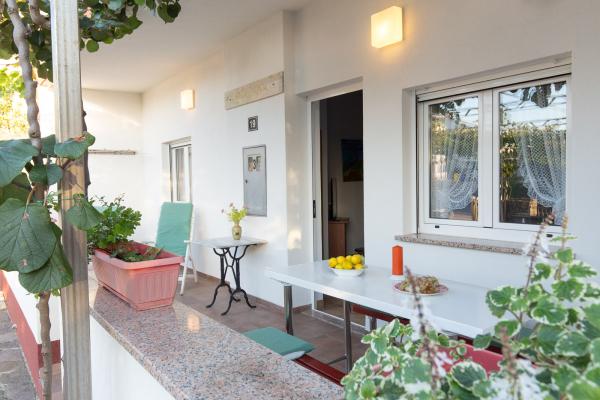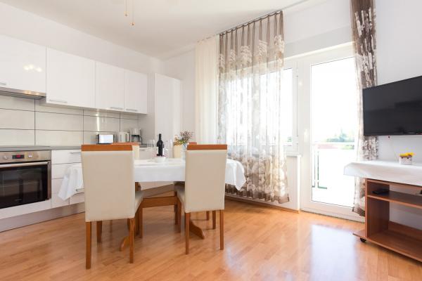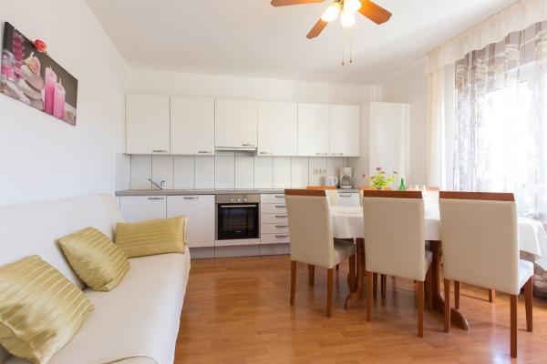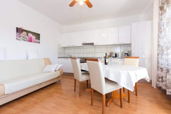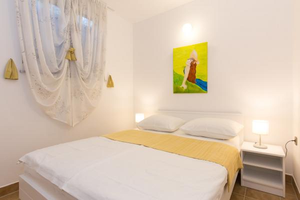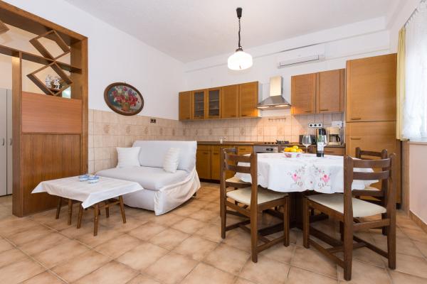 Apartmány o rozloze 70 m2 jsou dobře vybaveny blokovou kuchyní s myčkou, troubou, velkou lednicí s mrazákem, kuchyň je ve velké místnosti v komplexu s přijímací místností, kde může být i gauč. slouží jako přistýlka, apartmány mají prostorné 2 ložnice. Apartmány mají balkony s výhledem na moře. všechny apartmány mají klimatizaci, která se za příplatek, a také ventilátor, který příjemně chladí ve velkém obývacím pokoji s kuchyní, a okna mají sítě proti komárům. Apartmány se nacházejí 300 m od centra, 150 m od obchodu Konzum, 150 m od restaurace a 500 m od pláže.Dům má dvůr se 6 parkovacími místy ve stínu, v Bastě je krásný gril, olivami a voňavými květy levandule.