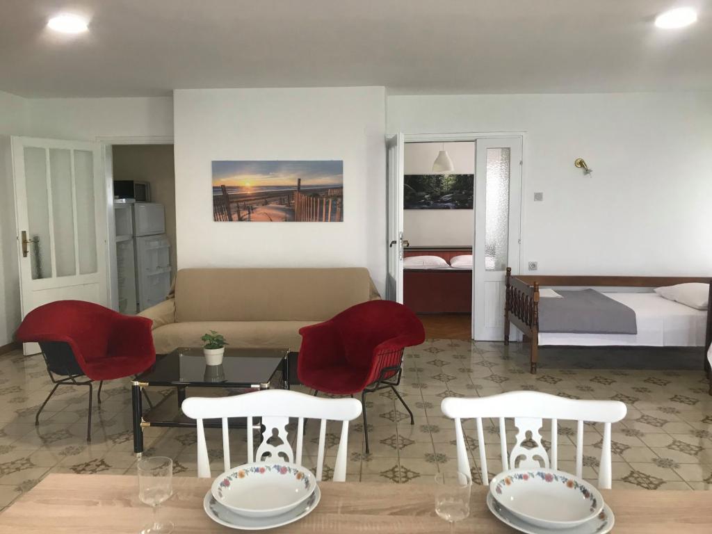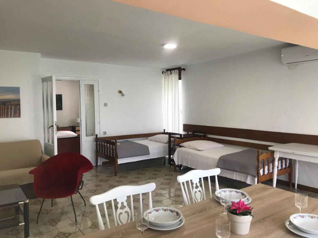Pobytová taxa je v ceně. Doklad o potvrzení rezervace při rezervaciApartmán 2+2 (55 m2) se nachází v přízemí a skládá se z ložnice s manželskou postelí, zatímco dvě přistýlky se nacházejí v obývacím pokoji (dvě postele s matracemi). Kuchyň je vybavena nádobím, lednicí s mrazákem, mikrovlnnou troubou, elektrickým sporákem s troubou, rychlovarnou konvicí a kávovarem. Apartmán má přední a zadní terasu. Domácí mazlíčci jsou vítáni za příplatek 5 € na den za zvíře. ------------------------------------------------------------------ Apartmán 4+2 (85 m2) se nachází v prvním patře a skládá se ze 2 ložnic s manželskými postelemi, zatímco 2 přistýlky se nacházejí v obývacím pokoji. Apartmán má koupelnu (sprcha/WC) a samostatnou toaletu. Kuchyň je vybavena nádobím, dvojitou lednicí s mrazákem, mikrovlnnou troubou, elektrickým sporákem s troubou, rychlovarnou konvicí a kávovarem na filtrovanou kávu. Apartmán má velkou terasu v přední části s výhledem do dvora a balkon s výhledem do zahrady.