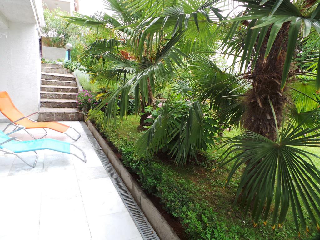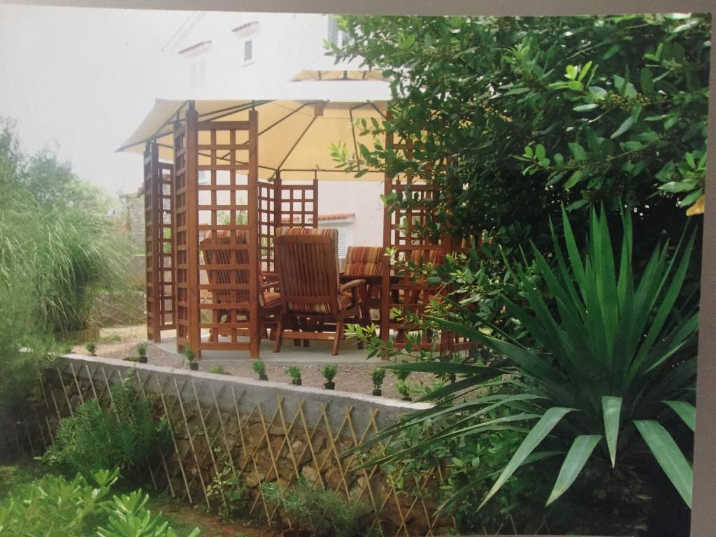 Pohled do zahrady a pavilonu, kde si hosté večer užívají romantické prostředí diskrétního osvětlení a květin se sklenkou dobrého vína a grilovanými pochoutkami. Vůně místních rybích specialit vychází z nedaleké rybí restaurace / 200 m od bytu /. Další zařízení v okolí: bowling, jízda na koni, různé vodní sporty, půjčovna kol, lodě, organizované výlety, dlouhé a krásné promenády jsou možnosti, které toto místo poskytuje.