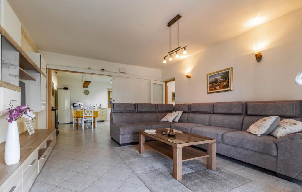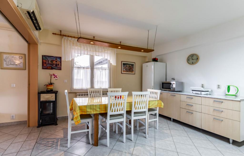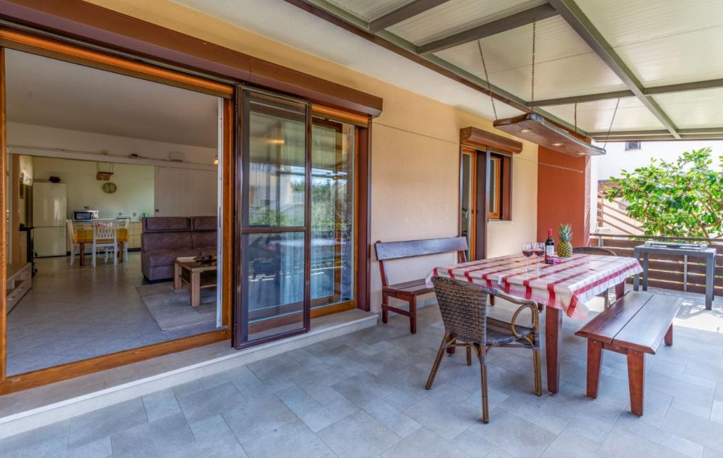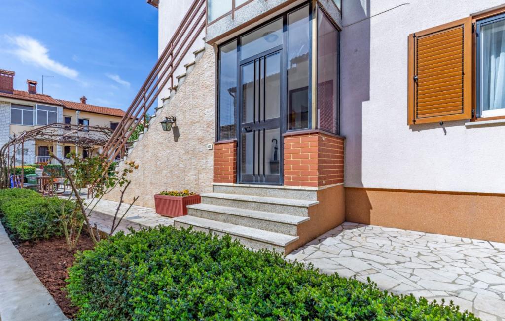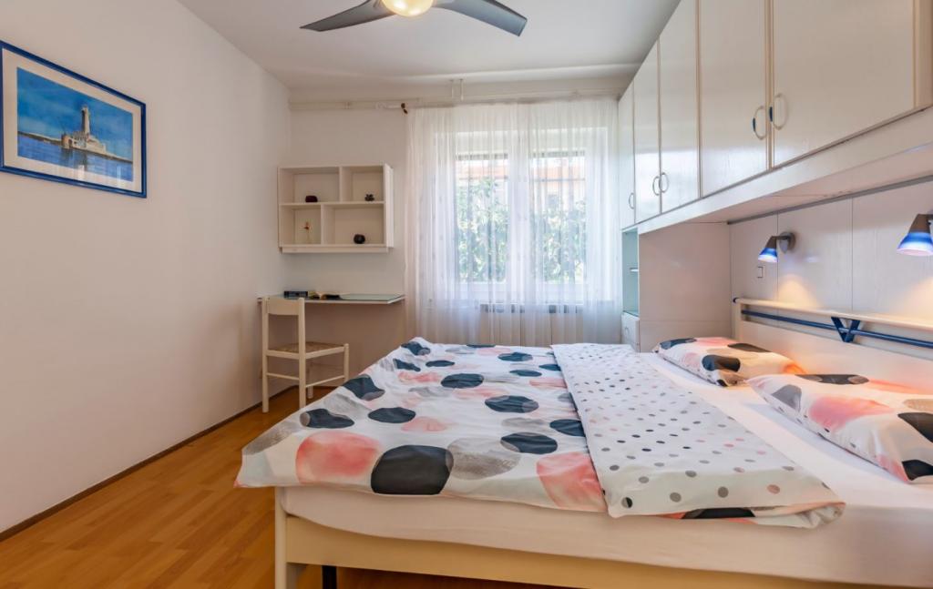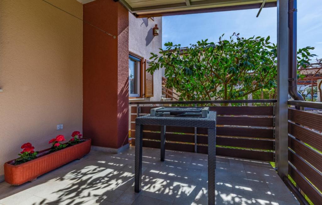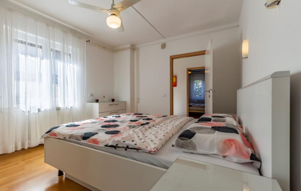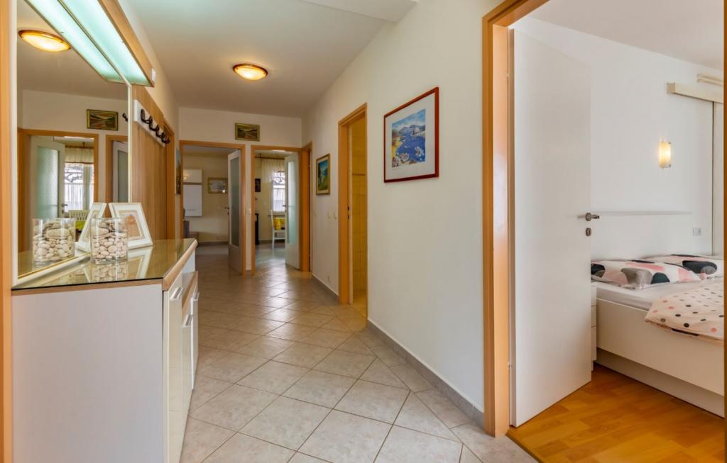 Byt se nachází v soukromém domě v klidné a tiché části Medulinu. Je ideální pro dvě rodiny. Byt obsahuje: 3 ložnice s manželskou postelí, obývací pokoj, kuchyň s jídelním koutem, 2 koupelny (jedna s vanou a WC, druhá se sprchou a WC). Má plně vybavenou kuchyňskou troubu, sporák, troubu, myčku nádobí, lednici, mikrovlnnou troubu, toustovač a kávovar. Další vybavení: pračka, satelitní TV, internetové připojení. Byt je obklopen vnitřní zahradou. V přední části bytu je terasa (30m²) s grilem, stolem a židlemi.