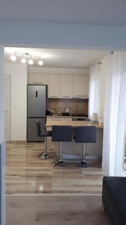 Byt s moderním designem, který se nachází v 1. patře bytového domu v klidné lokalitě Kompletně zrekonstruovaný byt, 1 ložnice + rozkládací pohovka, 2 balkony, kompletní nové vybavení, ložní prádlo, ručníky, klimatizace, Wi-Fi, parkování, lednice, pračka rublů