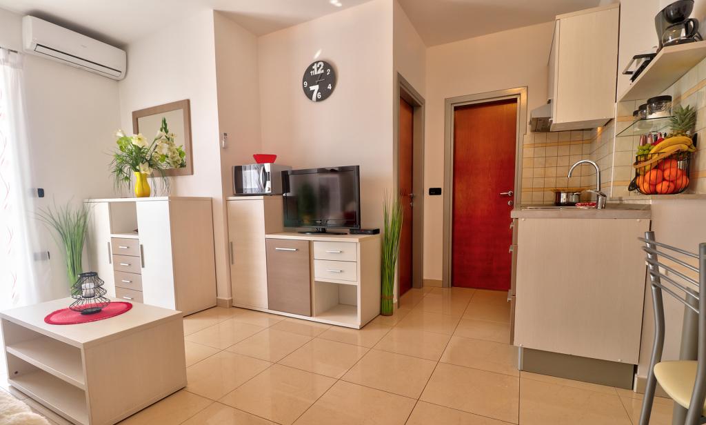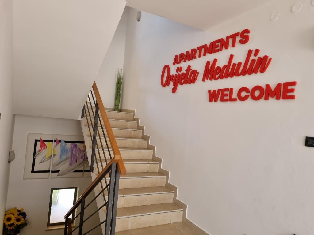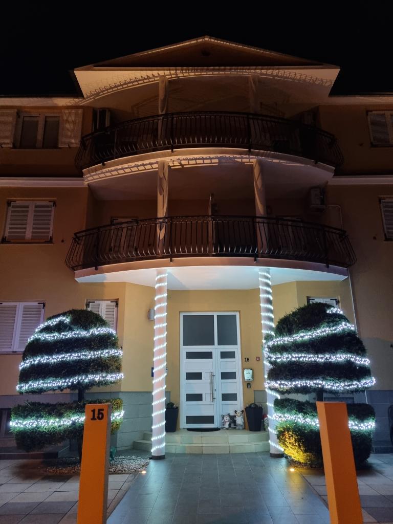Celková ubytovací kapacita v celém zařízení je pro 26 osob, vhodná pro sportovní týmy a větší skupiny osob. Plně vybavené apartmány v klidné části Medulinu, přímo nad hotelem a fotbalovým hřištěm. 10 minut chůze na písečnou pláž, 5 minut do centra. Upravená zahrada s trávníkem je ideální pro odpočinek a dětské hry. Parkování je u každého bytu před budovou. Garáž je k dispozici pro kola, romobily, motorky a všechny velké věci k moři... Ideální pro motorkáře nebo cyklisty nebo surfaře. Elektromobily lze nabíjet v garáži.