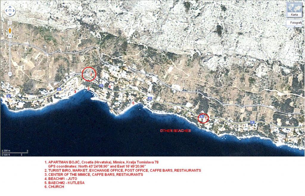 Apartmány Bojić se nacházejí v Mimicích 12 km od Omiše směrem na Makarskou, na hranici s Marusici. Jsou 15 m od hlavní silnice a 500 m od centra. Dům se skládá ze tří apartmánů, všechny apartmány mají balkony s výhledem na moře, poskytují příjemnou, bezpečnou a klidnou dovolenou pro celou rodinu, daleko od centra, s pláží bez mnoha koupajících se. Moře je extrémně čisté (podvodní prameny a elektřina) pro koupání a potápění. Mluvíme velmi dobře anglicky, komunikujeme česky, italsky a německy. Klimatizace, Wi-fi, pobytová taxa a parkování v ceně. Pomáháme hostům najít potřebné informace a po dohodě uspořádat další aktivity.