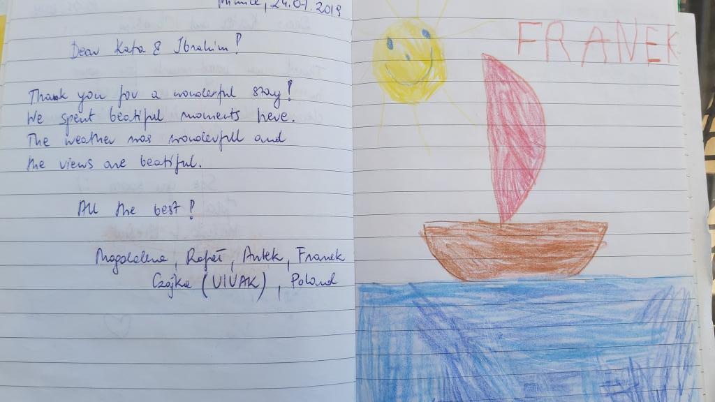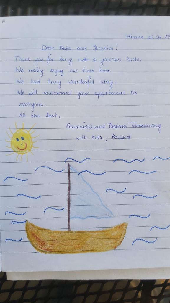 Strávili jsme 10 dní v bytě s dětmi. Byla to skvělá dovolená, všichni si to opravdu užili. Dům se nachází v klidné oblasti, obklopen velkou zahradou. Na pláž je to 10 minut pěšky. Cesta je trochu strmá, protože dům stojí na svahu, ale na oplátku vše vykompenzuje výhled z terasy. K dispozici jsou také skvělé výlety ve směru na starou vesnici a na horu. Také s nádherným panoramatem. Byt je útulný, čistý a dobře vybavený, má vše, co zajišťuje pohodlný pobyt. Naši hostitelé jsou nekonečně milí a nápomocní, děkujeme za nezapomenutelnou dovolenou!