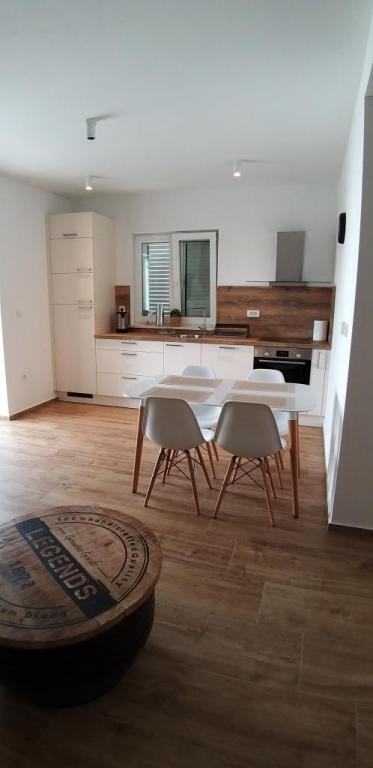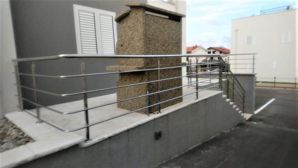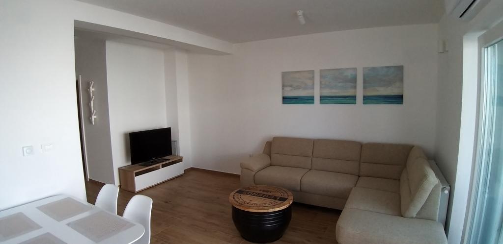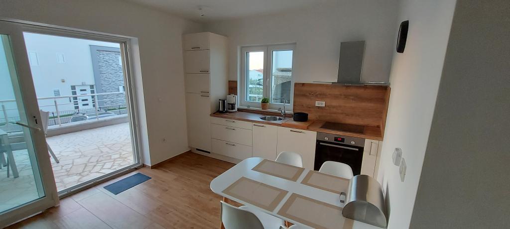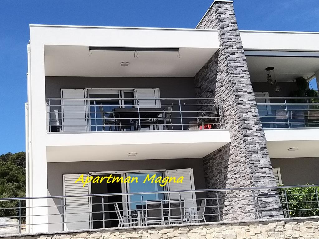 Apartmán "MAGNA" se nachází v bezprostřední blízkosti městské pláže, 1000 m od centra města a nabízí krásný výhled na moře. Byt má rozlohu 60 m2, má dvě ložnice, kde se může ubytovat až 5 dospělých. Apartmán se nachází v přízemí (vyznačeno na obrázku) a hosté mají přístup na terasu s grilem. Parkování je před domem a je zahrnuto v ceně. Domácí mazlíčci nejsou povoleni.
