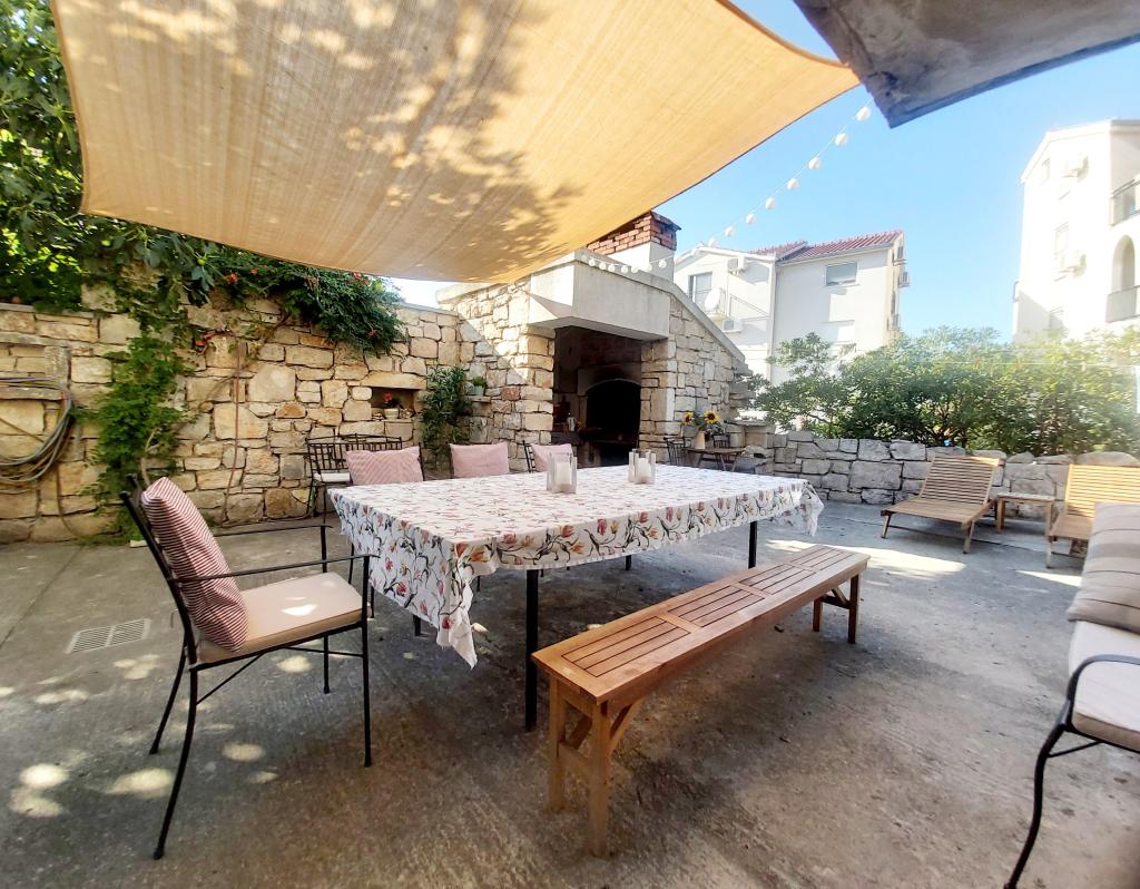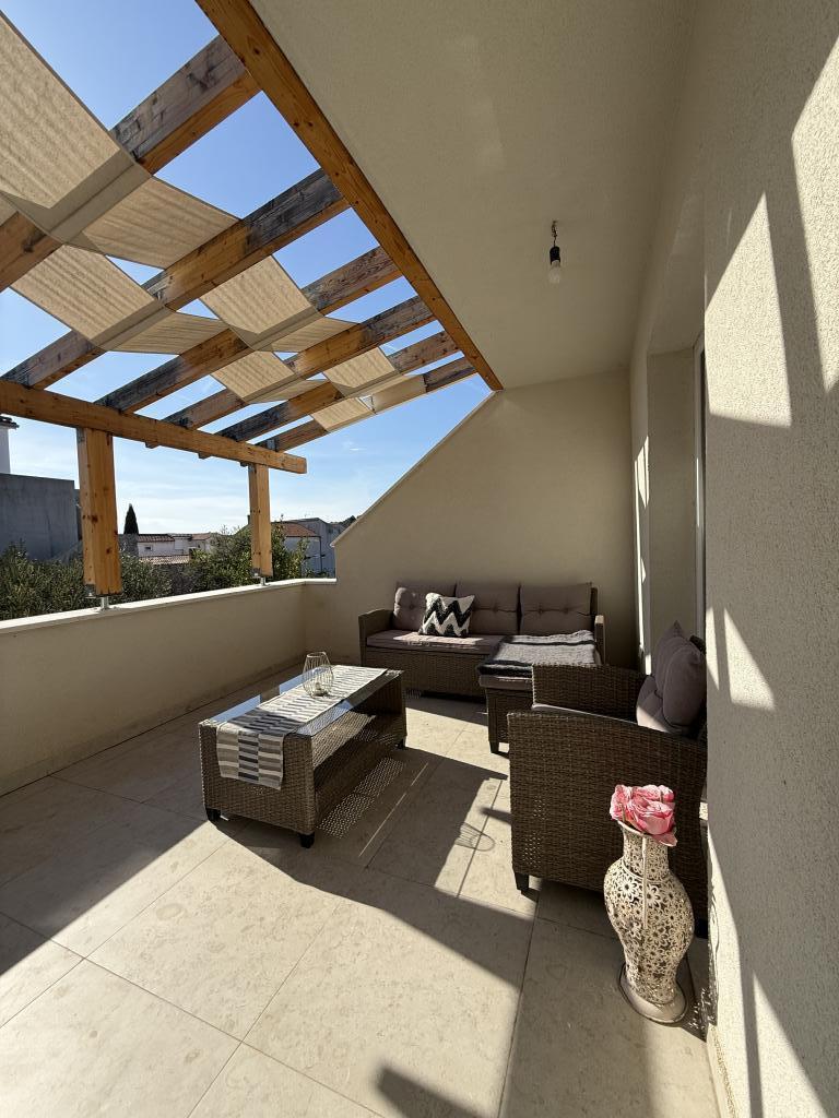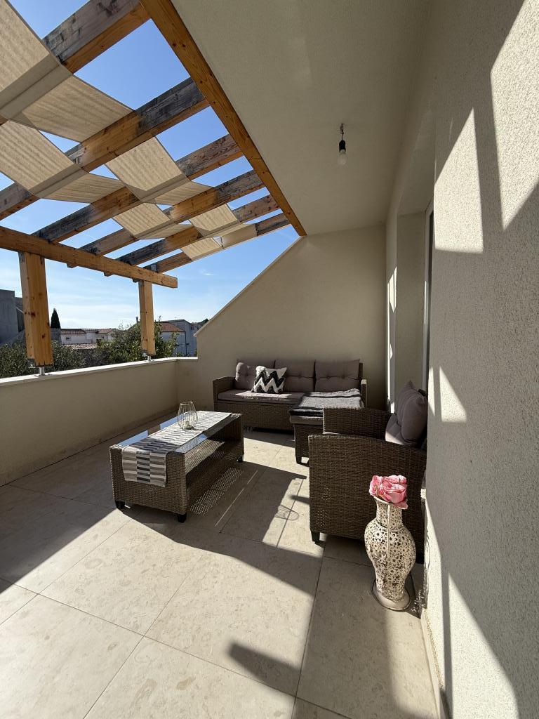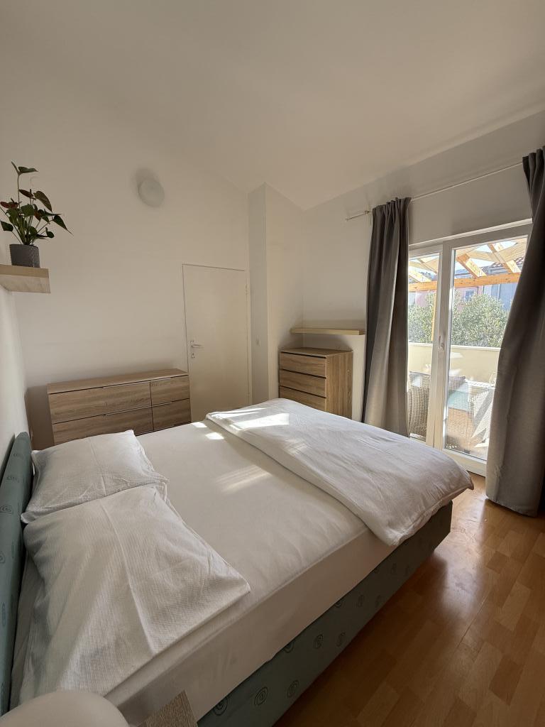 Studiový apartmán s terasou o rozloze 12 m2. Apartmán je určen pro 2 osoby. Velká manželská postel, plně vybavená kuchyň, jídelní stůl, koupelna. Terasa a jídelní stůl. Zajištěné parkovací místo před apartmánem pro jedno vozidlo. Blízko pláže. Apartmán se nachází 5 minut chůze od pláže Slanica a 7 minut chůze od centra Murteru.