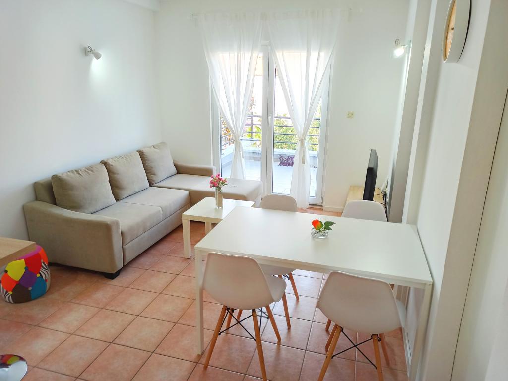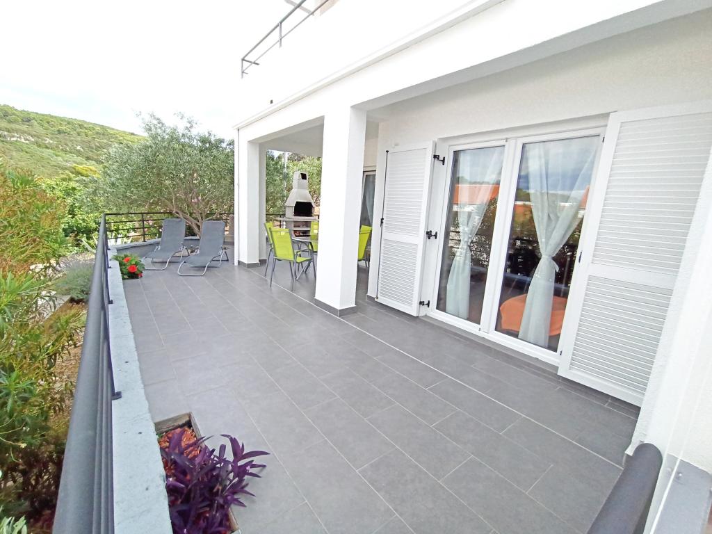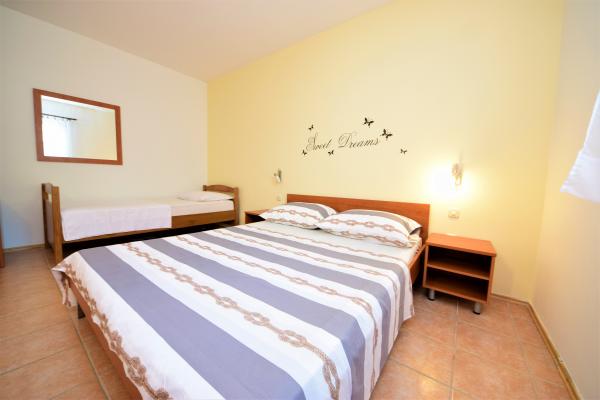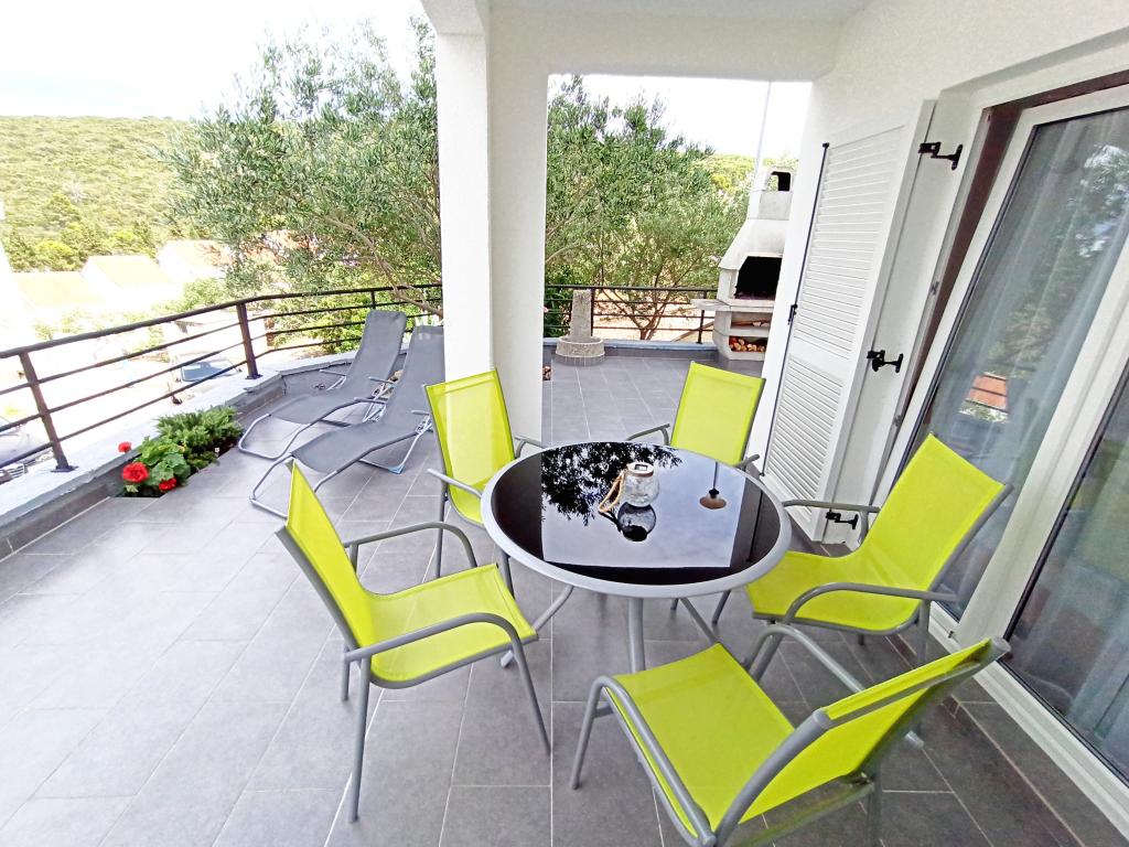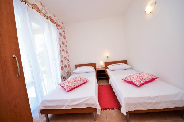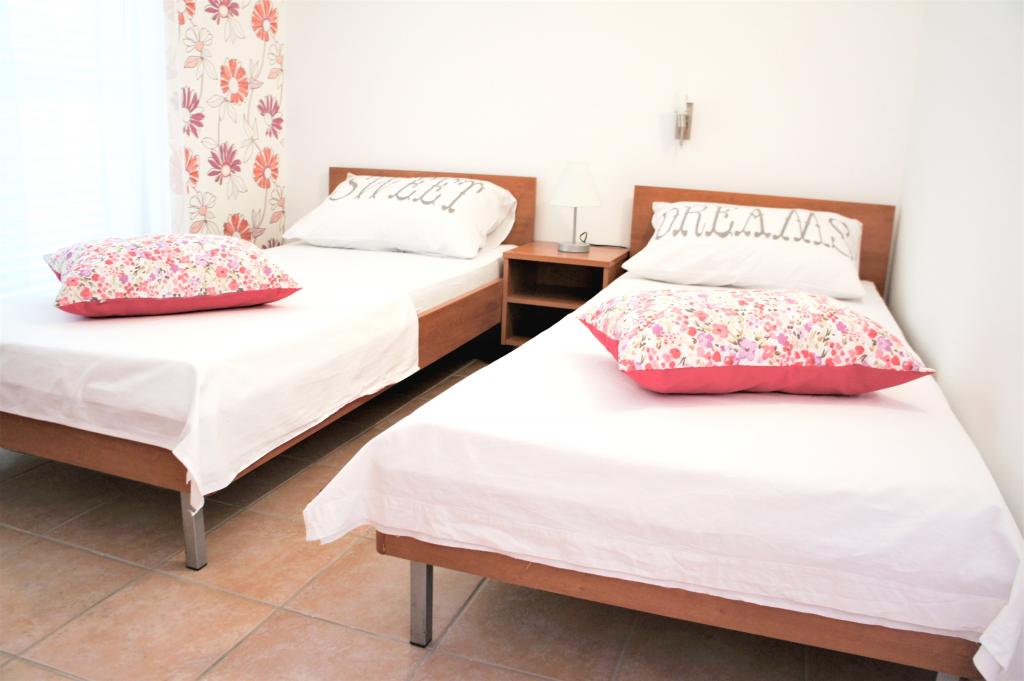 Plně a moderně vybavený apartmán se nachází ve zvýšeném přízemí malého domu. Byt se skládá z: Kuchyně: vybavená vším potřebným pro příjemný pobyt: - Obývací pokoj s klimatizací a LCD TV. V obývací části je také pohovka, kterou lze v případě potřeby proměnit v pohodlnou postel. -Kompletně nová kuchyně, plně vybavená (zahrnuje sporák, myčku, troubu, kompletní nádobí, mikrovlnku). Skládá se ze 2 ložnic: Pokoj 1: sestává z jedné manželské postele a jednoho samostatného lůžka Pokoj 2: sestává ze 2 samostatných lůžek WC-sprchový kout, se všemi hygienickými prvky a pračkou Zvláštností apartmánu je velká terasa na jižní straně, kterou si můžete užívat po celý den. Na terase je venkovní jídelní set a gril. Na terase je velký olivovník, který poskytuje přirozený stín po celý den. Přímo před bytem je soukromé parkoviště.