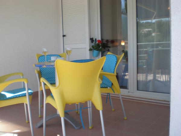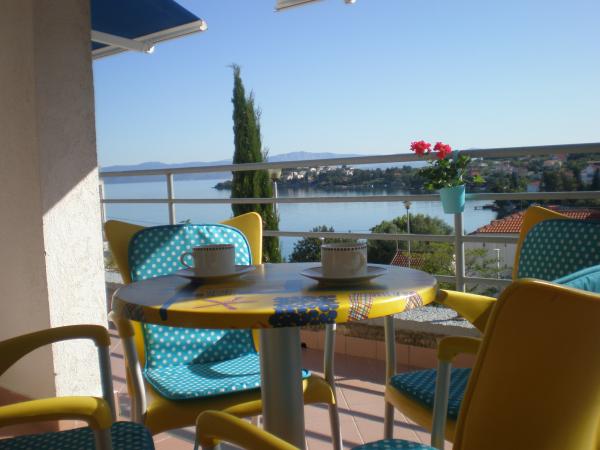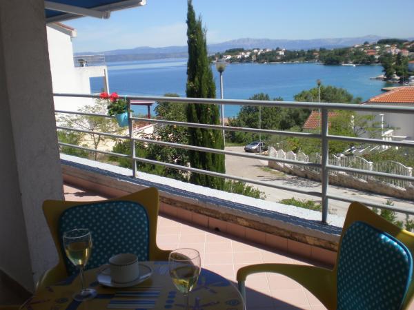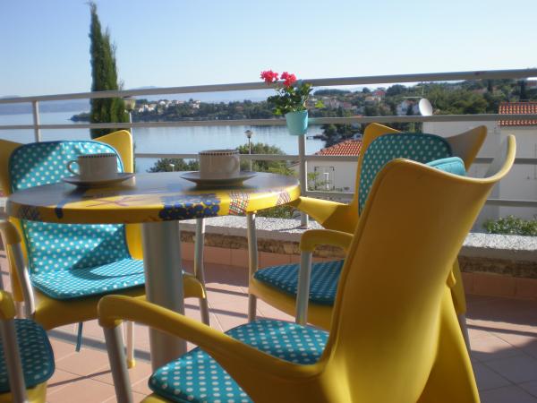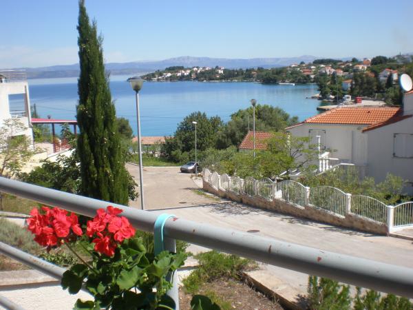 Plně a moderně vybavený apartmán v bezprostřední blízkosti oblázkové pláže. Zařízení se nachází 2 minuty chůze od pláže a centra města. Skládá se ze vstupní chodby, dvou ložnic, koupelny, obývacího pokoje s kuchyní a velkého balkonu. Z balkonu je výhled na pláž, borový les, záliv a v dálce na ostrov Čiovo a město Split. Ve větší ložnici jsou postele pro tři osoby: velká postel pro dvě osoby a postel pro jednu osobu. Menší pokoj je vybaven jedním lůžkem pro dvě osoby, jehož orientace umožňuje hostovi probudit se s výhledem na moře z postele. Kuchyň je vybavena všemi potřebnými domácími spotřebiči: lednice, trouba, sporák, myčka, pračka, varná konvice a další kuchyňské náčiní. Hostům jsou k dispozici elektrické grily a grily na dřevěné uhlí. V obývacím pokoji je velký kuchyňský stůl, sedací souprava a televize. U apartmánu je veřejné parkoviště, které je zdarma, ale rezervace není možná.