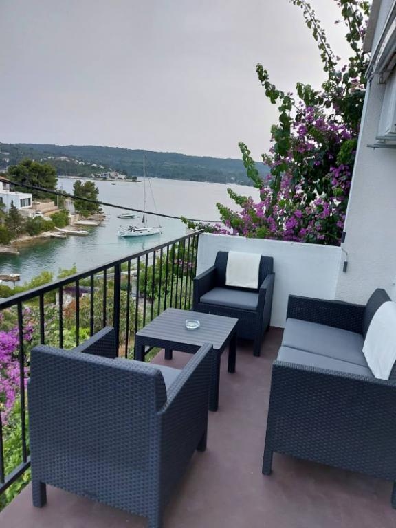 Prostorný a dobře vybavený apartmán s velkou terasou a krásným výhledem, na klidném místě se spoustou zeleně a stínu u moře. Majitel je milý, ochotný a nevtíravý.
