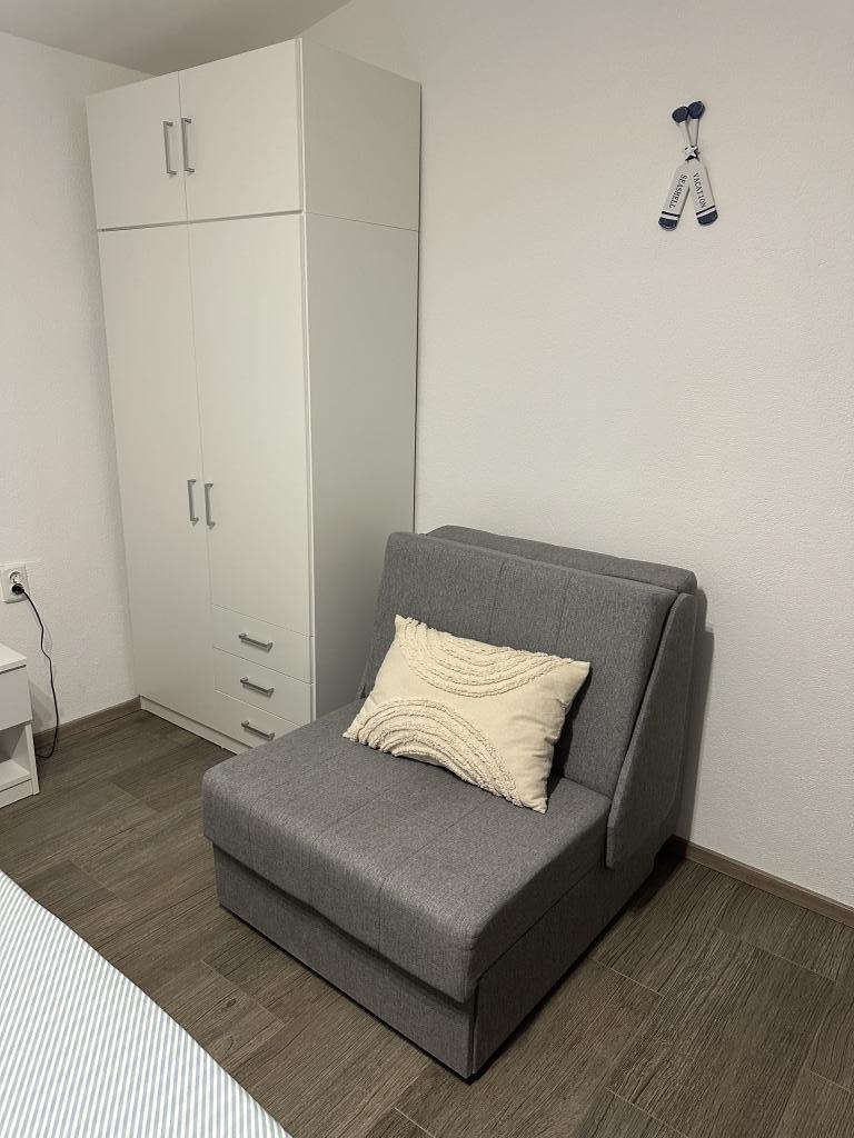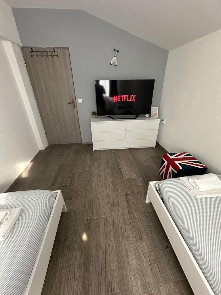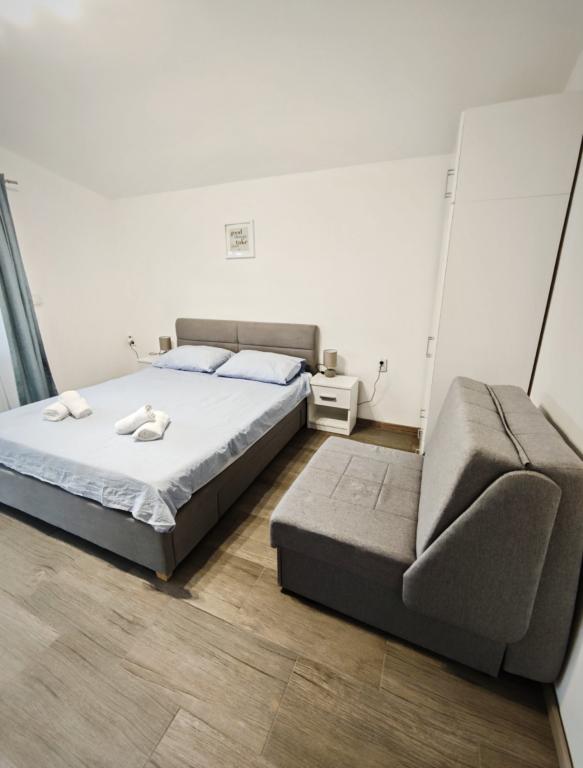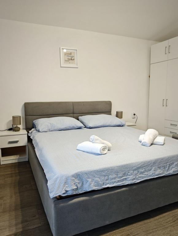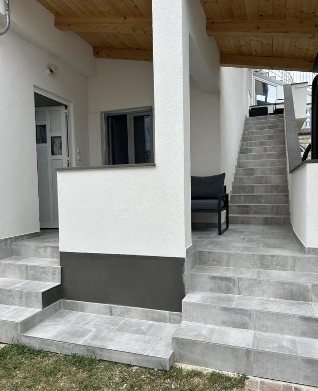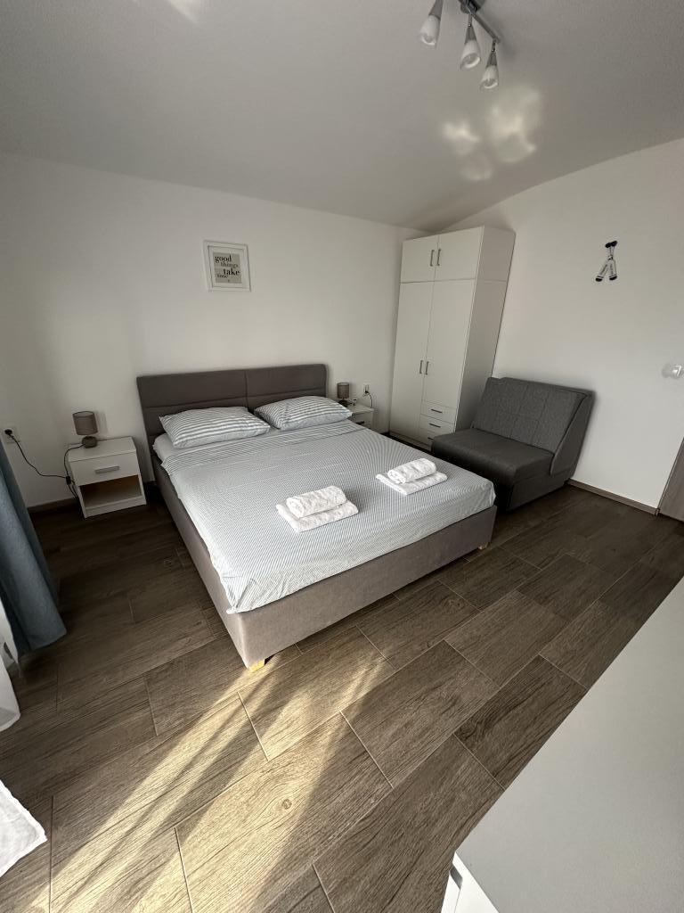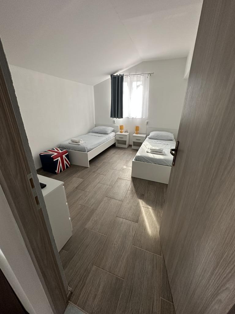 Vážení hosté, přivítá vás 75m2 velký apartmán se dvěma ložnicemi, kuchyní, koupelnou a velkou terasou s výhledem na moře a hory. Rekonstrukce je dokončena, byly zveřejněny nové fotografie. Přivítá vás mnoho nových věcí: nová fasáda, nová okna, nové dveře, nové podlahy v pokojích atd. Apartmán se nachází 70 m od moře (1 minuta). Pláž je betonová a místy oblázková. Apartmán je vybaven novými spotřebiči zakoupenými v sezóně 2024 a 2025 a zahrnuje: klimatizaci, wi-fi, smart TV s Netflixem a Disney+ v obou pokojích, myčku nádobí, rychlovarnou konvici, toustovač, pračku, mixér Nutribullet, kávovar Nespresso atd. Všechny spotřebiče jsou nové, stejně jako veškerý nábytek. Všechny streamovací služby můžete sledovat zdarma. Na hosty čeká soukromé parkování. Na dvoře je gril. Apartmán je ideální pro rodiny s dětmi. Bezplatný odběr je možný na letišti nebo autobusovém nádraží. Horní apartmán je určen pro hosty, majitelé bydlí ve spodním.