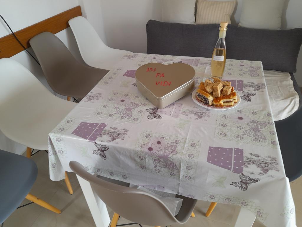 Všichni hosté jsou vítáni, vítáme je uvítacím nápojem a kávou. Pro všechny hosty, kteří apartmán užívají v září, máme obzvláště výhodné ceny. Pokud se rozhodne apartmán využívat rodina s menším počtem členů, na ceně užívání apartmánu se dohodneme. Dvůr s grilem a venkovní solární sprchou je k dispozici všem. Vzhledem k tomu, že se apartmán nachází ve slepé ulici, je dvůr ideální pro hraní dětí. Ceny apartmánu v květnu a září jsou příznivější. Na všem se domluvíme. V blízkosti apartmánu se nacházejí supermarkety, tržnice, pekárna, řeznictví, rybárna a bankomaty.