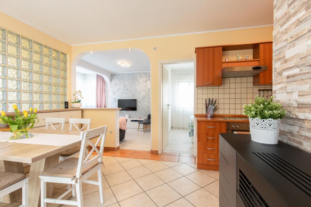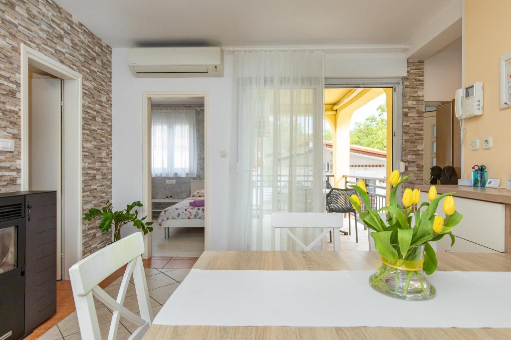 Plně vybavený apartmán se nachází v prvním patře budovy, v klidné části Njivica, 5 minut chůze do centra nebo na pláž. Skládá se z kuchyně s jídelnou, obývacího pokoje, koupelny se sprchovým koutem, pokoje s manželskou postelí, pokoje se dvěma samostatnými lůžky a terasy. Bezplatné parkování je v budově.