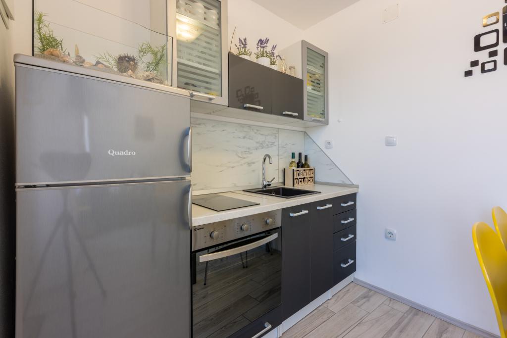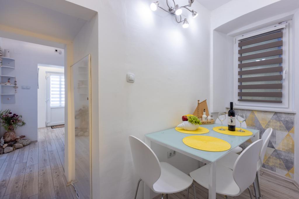 Apartmán Bionda má rozlohu cca 50m2 a skládá se z kuchyně, koupelny, obývacího pokoje a ložnice. Je určen pro max. 4 osoby, v ložnici je umístěna manželská postel, v obývacím pokoji je pohovka, která se rozkládá na postel o rozměru 160x200cm. Byt se nachází v centru města, v jeho starém městě, není rušné. Od moře vás dělí jen 20 schodů a od centrálního náměstí jen asi 50 m. Byt je klimatizovaný a plně vybavený pro každodenní potřeby. (LED TV v obývacím pokoji a v ložnici, kuchyň vybavená troubou, varnou deskou, lednicí s mrazákem, deštník k dispozici, ložní prádlo se mění jednou týdně) Během pobytu u nás máte k dispozici parkovací lístek na veřejném parkovišti parkoviště.