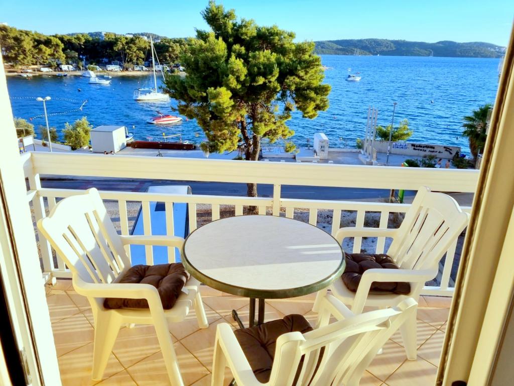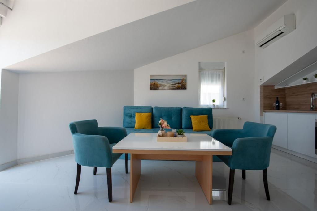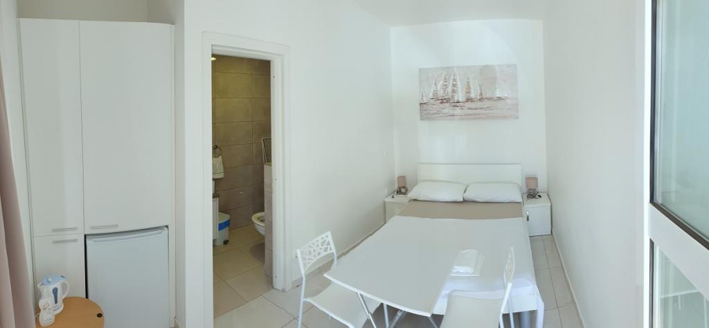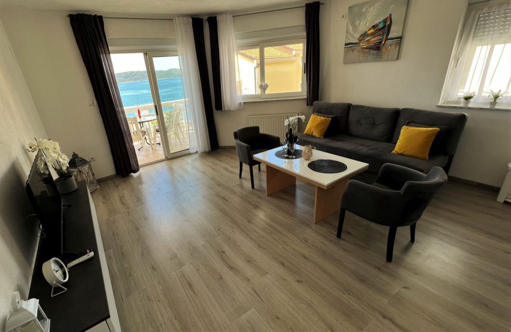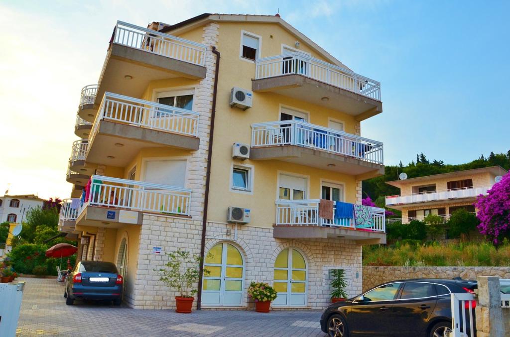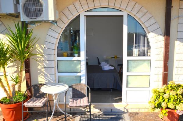 Pobytová taxa je v ceně.Nabízíme prostorné apartmány se dvěma ložnicemi a krásným výhledem na moře, ideální pro 2 + 2 osoby, dále pokoje a studiový apartmán pro dvě osoby - ideální pro páry nebo jednotlivce hledající klid a pohodlí přímo na pobřeží. Každý apartmán je vybaven vlastní koupelnou, satelitní TV, ložnicí s přístupem na terasu a prostorným obývacím pokojem, který má také terasu s posezením - ideální pro ranní kávu s výhledem na moře. V obývacím pokoji je rozkládací pohovka (rozměry 160x200 cm), která slouží jako přistýlka pro dvě osoby. Kuchyň v obývacím pokoji je plně vybavená - s lednicí, sporákem a potřebným nádobím pro vaření, jídlo a pití. Apartmány se nacházejí ve druhém a třetím patře domu a všechny jsou klimatizované, což zajišťuje příjemný pobyt i během nejteplejších letních dnů. Ručníky jsou k dispozici každému hostu - jeden velký (140x70 cm) a jeden malý (100x40 cm) a vyměňují se po dohodě nebo na požádání. Pohodlí, čistota a zábava