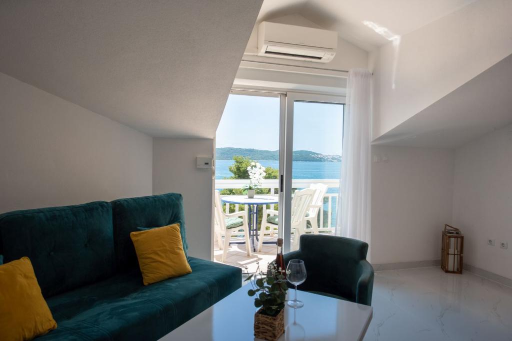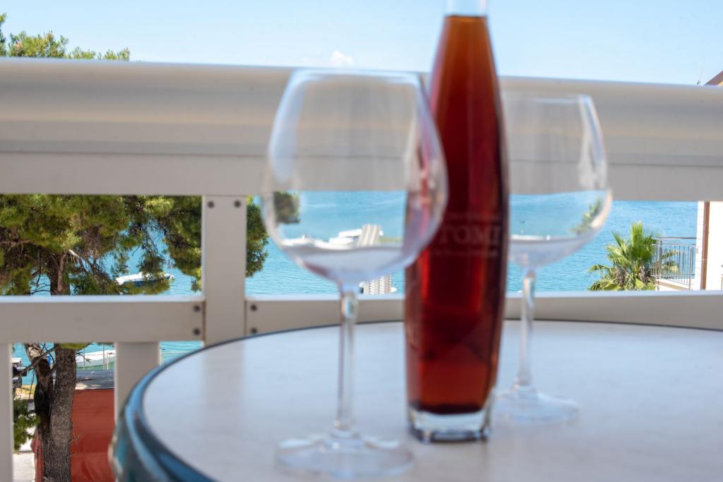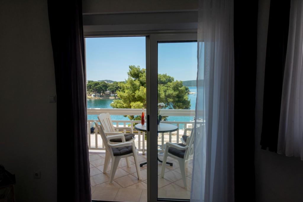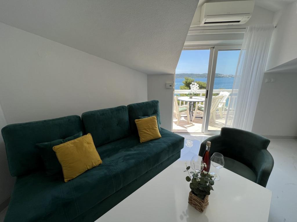 Pobytová taxa je v ceně.Nabízíme prostorné apartmány se dvěma ložnicemi a krásným výhledem na moře, ideální pro 2 + 2 osoby, dále pokoje a studiový apartmán pro dvě osoby - ideální pro páry nebo jednotlivce hledající klid a pohodlí přímo na pobřeží. Každý apartmán je vybaven vlastní koupelnou, satelitní TV, ložnicí s přístupem na terasu a prostorným obývacím pokojem, který má také terasu s posezením - ideální pro ranní kávu s výhledem na moře. V obývacím pokoji je rozkládací pohovka (rozměry 160x200 cm), která slouží jako přistýlka pro dvě osoby. Kuchyň v obývacím pokoji je plně vybavená - s lednicí, sporákem a potřebným nádobím pro vaření, jídlo a pití. Apartmány se nacházejí ve druhém a třetím patře domu a všechny jsou klimatizované, což zajišťuje příjemný pobyt i během nejteplejších letních dnů. Ručníky jsou k dispozici každému hostu - jeden velký (140x70 cm) a jeden malý (100x40 cm) a vyměňují se po dohodě nebo na požádání. Pohodlí, čistota a zábava