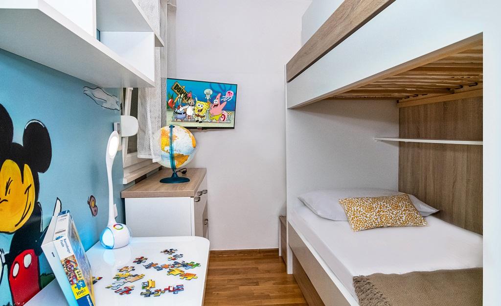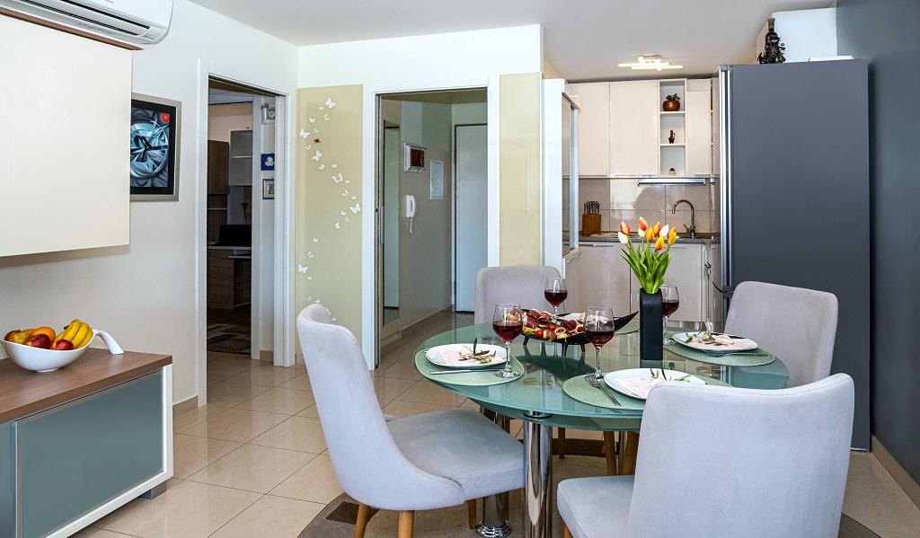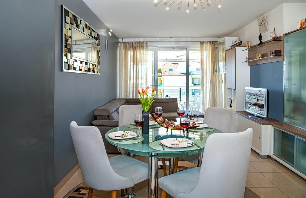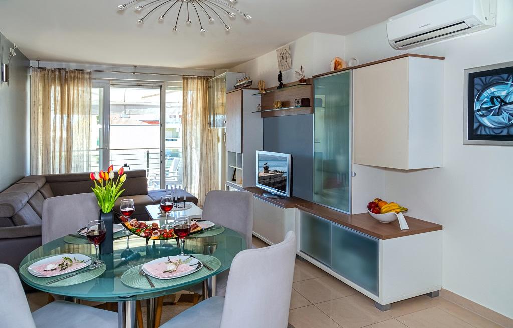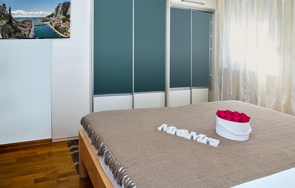 Nový, moderní byt v bezprostřední blízkosti řeky Cetiny a Jaderského moře. S obytnou plochou 65 m2 se v něm pohodlně ubytuje až 4+1 osoba a z balkonu je výhled na řeku a ústí Cetiny. Byt se nachází ve třetím patře. V budově je výtah. Byt se skládá ze dvou ložnic, jedné koupelny, dobře vybavené kuchyně s jídelním koutem, obývacího pokoje a zastřešeného balkonu s výhledem na řeku. V první ložnici je velká postel (180 x 200) pro 2 osoby, noční stolky a úložný prostor pro vaše oblečení a zavazadla. Druhá ložnice má dvě lůžka (90 x 200) pro 2 osoby, noční stolky a úložný prostor pro vaše oblečení a zavazadla. Obě ložnice jsou světlé a mají spoustu přirozeného světla přes střešní okno. V ložnicích je klimatizace. Skládá se z obývacího pokoje a jídelny v jednom prostoru a velmi moderní, otevřené kuchyně. K dispozici je také nová kuchyňská linka s nejnovějšími spotřebiči, včetně 4 plotýnkové elektrické varné desky, elektrické trouby, lednice s mrazákem, rychlovarné konvice a veškerého nádobí potřebného pro vlastní vaření. Hned vedle kuchyně je jídelna se stolem pro 4 osoby. Dále je zde obývací pokoj s televizí, elegantní rozkládací pohovkou a konferenčním stolkem. Má TV a Wi-Fi. Chlazení a topení v obývacím pokoji a kuchyni s klimatizací. Skleněné posuvné dveře v obývacím pokoji se otevírají přímo na balkon. Balkon má panoramatický výhled na řeku a moře. Pokud přijedete autem, kolem budovy je veřejné městské parkoviště. Náš apartmán je 500 metrů od města Omiš, což je vlastně jen 5 minut chůze od nás. Písečná pláž (500 metrů) je vzdálena pár minut chůze.