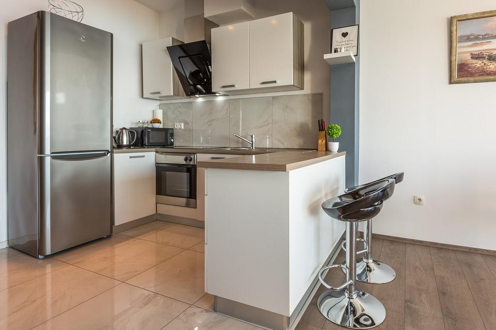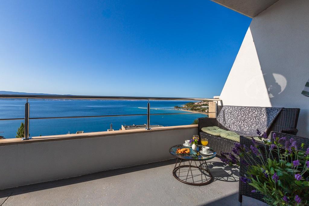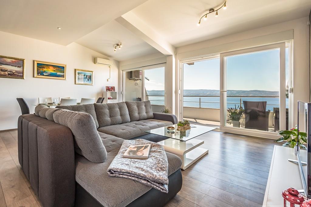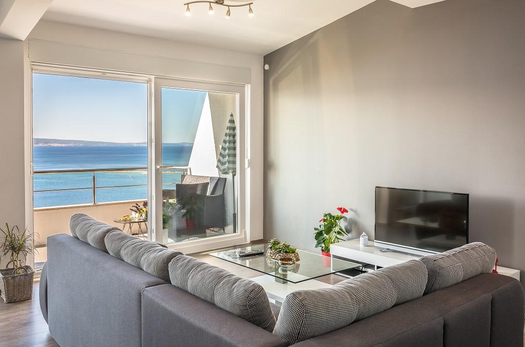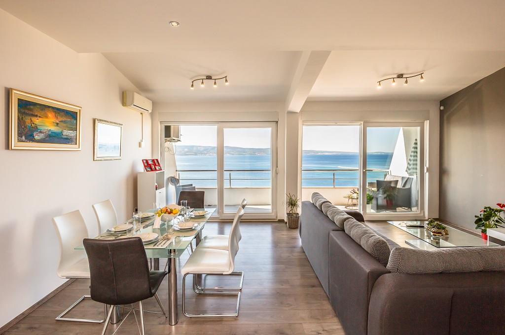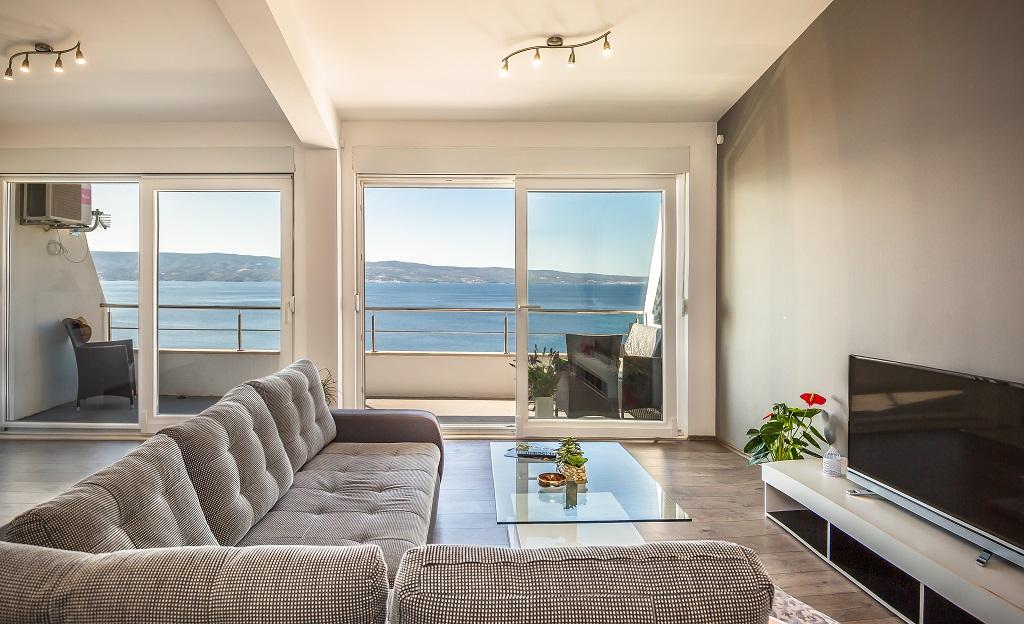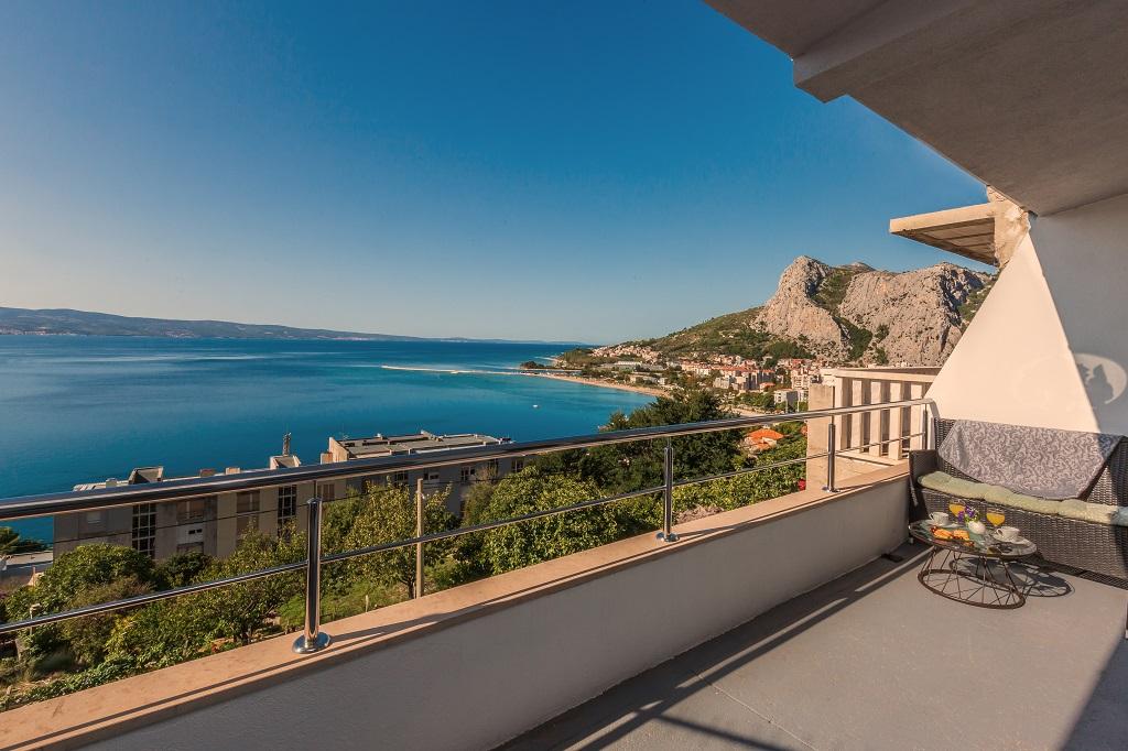 NOVÝ A MODERNÍ BYT. Byt se nachází v soukromém rodinném domě s výhledem na moře, ostrovy a místní pláže. Blízko centra Omiše, pouhých 500m. Vše je zcela nové. Byt má 95 m2. Má 3 ložnice, obývací pokoj, kuchyň s jídelnou, toaletu a další koupelnu, balkon a parkovací místo v garáži. Ložnice: Jeden pokoj má velkou postel (180 x 190) pro 2 osoby. Ve druhém pokoji je francouzská postel (160 x 190) pro 2 osoby. Třetí pokoj má samostatné lůžko (90 x 190) pro 1 osobu. Koupelna s umyvadlem a sprchovým koutem. WC s umyvadlem a pračkou. Kuchyň je plně vybavená. Obývací pokoj je prostorný. Velký balkon s posezením.