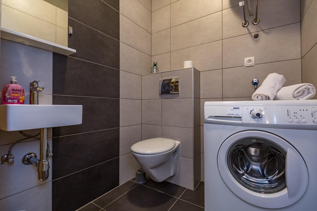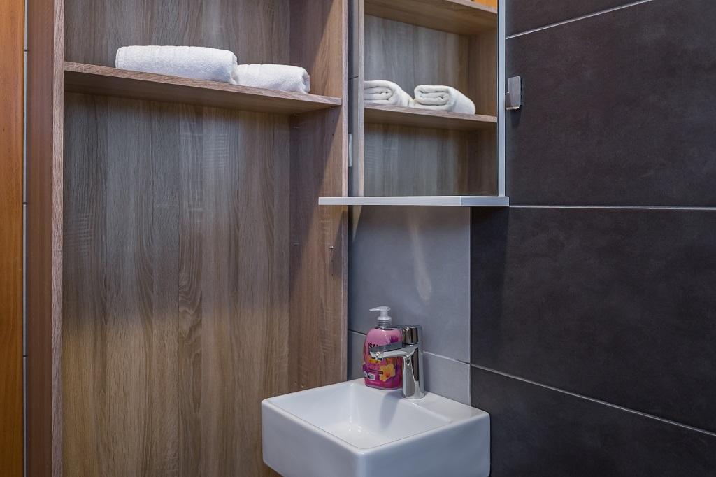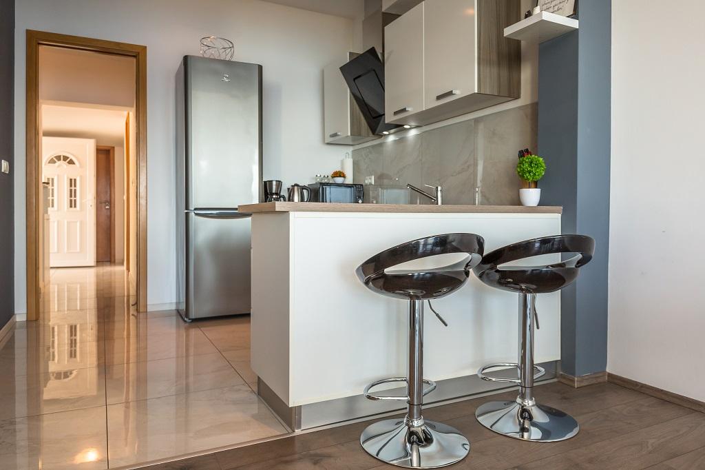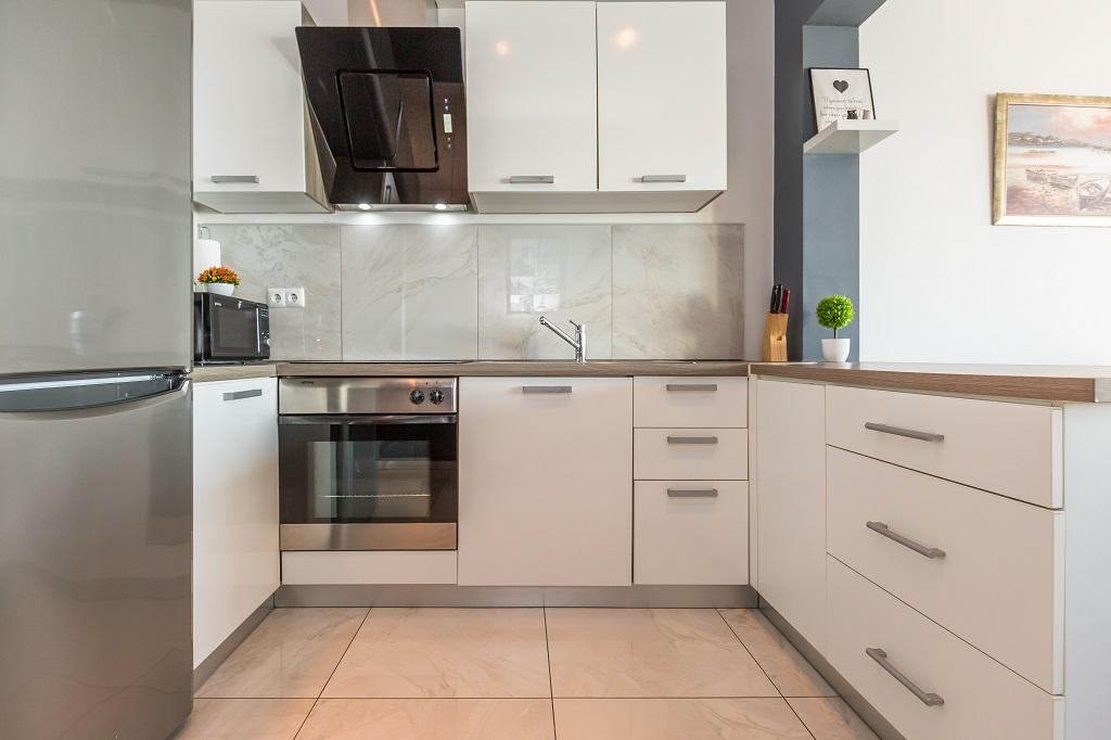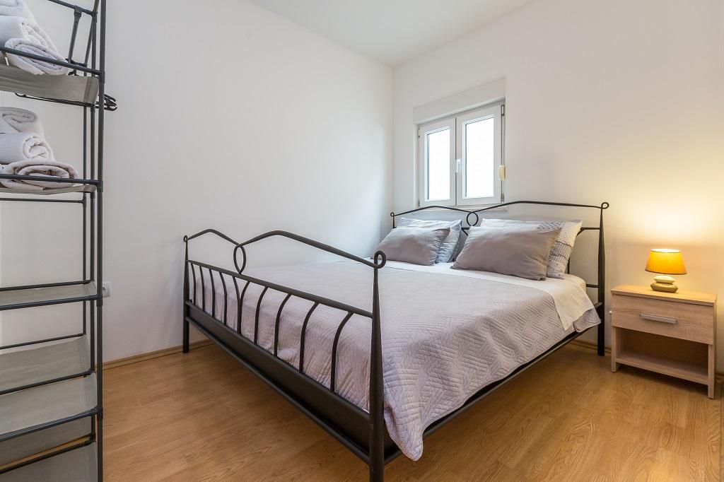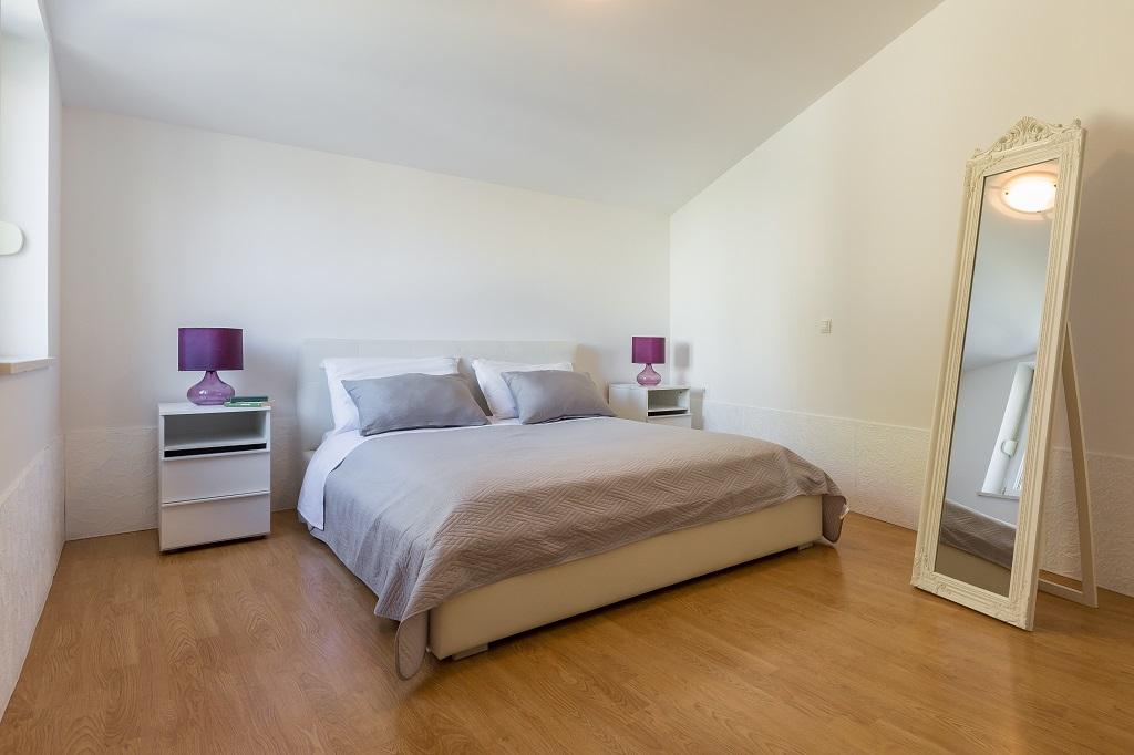 NOVÝ A MODERNÍ BYT. Byt se nachází v soukromém rodinném domě s výhledem na moře, ostrovy a místní pláže. Blízko centra Omiše, pouhých 500m. Vše je zcela nové. Byt má 95 m2. Má 3 ložnice, obývací pokoj, kuchyň s jídelnou, toaletu a další koupelnu, balkon a parkovací místo v garáži. Ložnice: Jeden pokoj má velkou postel (180 x 190) pro 2 osoby. Ve druhém pokoji je francouzská postel (160 x 190) pro 2 osoby. Třetí pokoj má samostatné lůžko (90 x 190) pro 1 osobu. Koupelna s umyvadlem a sprchovým koutem. WC s umyvadlem a pračkou. Kuchyň je plně vybavená. Obývací pokoj je prostorný. Velký balkon s posezením.