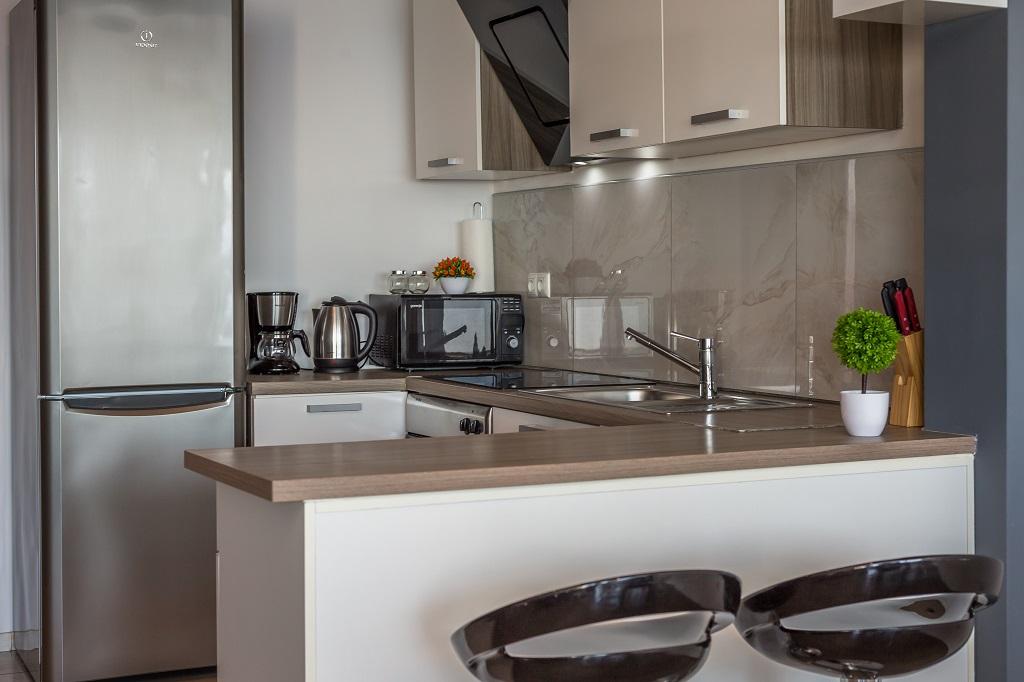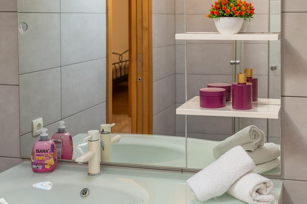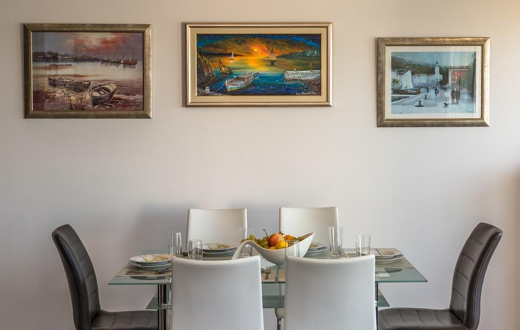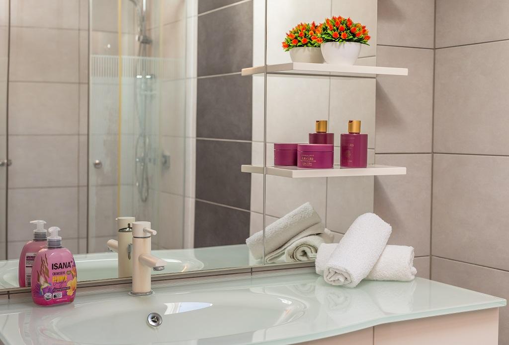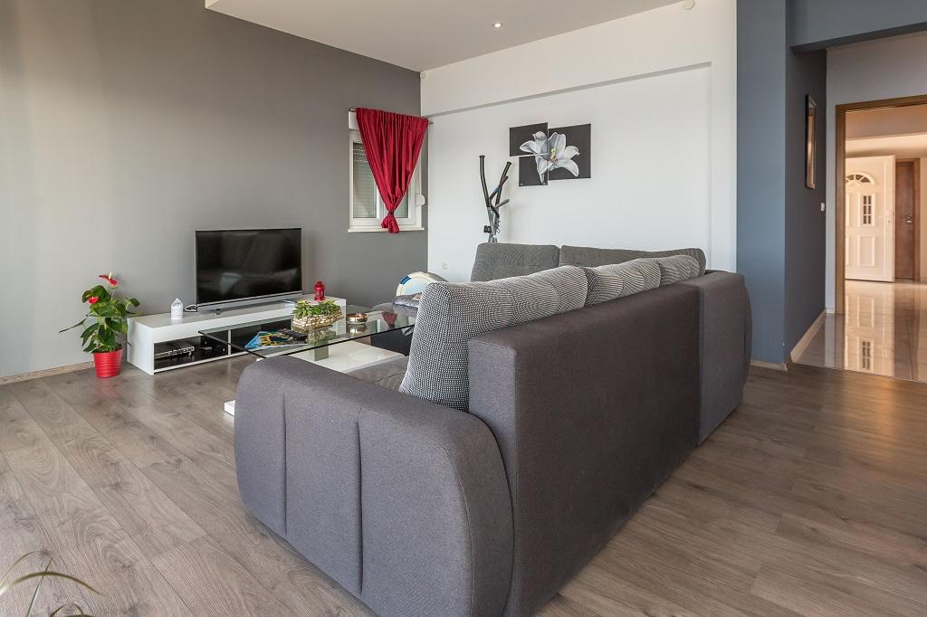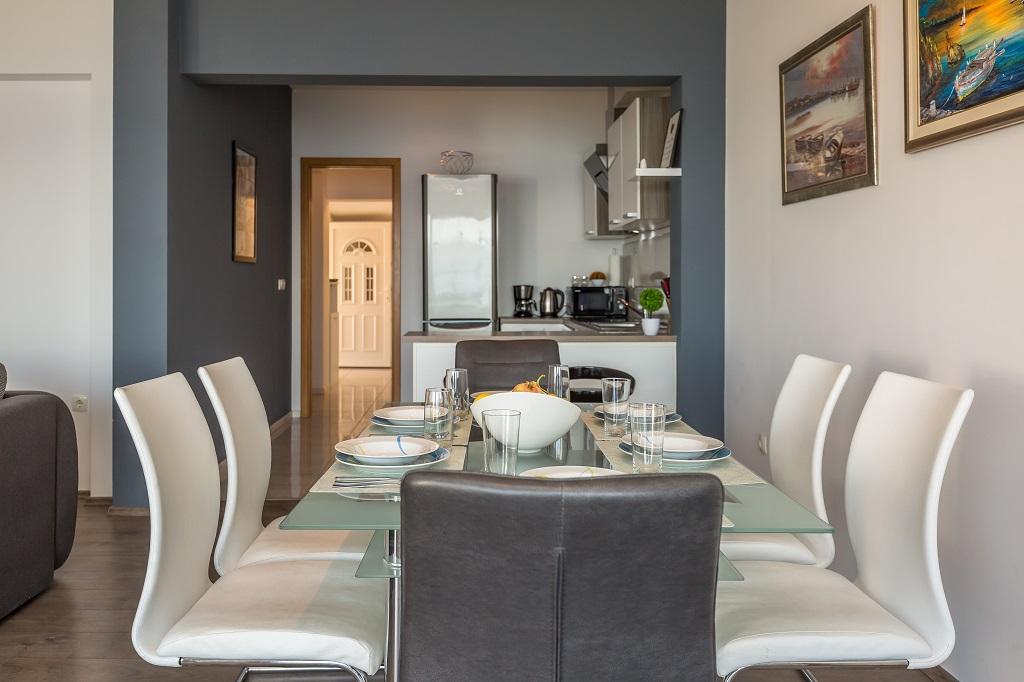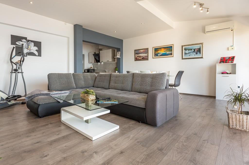NOVÝ A MODERNÍ BYT. Byt se nachází v soukromém rodinném domě s výhledem na moře, ostrovy a místní pláže. Blízko centra Omiše, pouhých 500m. Vše je zcela nové. Byt má 95 m2. Má 3 ložnice, obývací pokoj, kuchyň s jídelnou, toaletu a další koupelnu, balkon a parkovací místo v garáži. Ložnice: Jeden pokoj má velkou postel (180 x 190) pro 2 osoby. Ve druhém pokoji je francouzská postel (160 x 190) pro 2 osoby. Třetí pokoj má samostatné lůžko (90 x 190) pro 1 osobu. Koupelna s umyvadlem a sprchovým koutem. WC s umyvadlem a pračkou. Kuchyň je plně vybavená. Obývací pokoj je prostorný. Velký balkon s posezením.