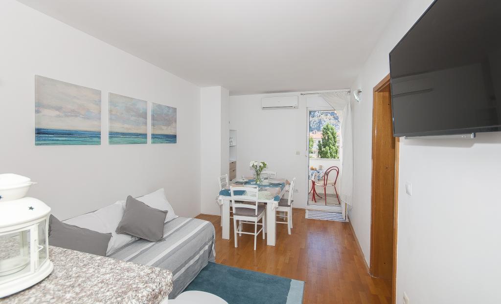 Apartmán Luna *** se nachází v nové části Omiše, pouhých 7 minut chůze od centra starého města a písečné pláže. Byt se rozkládá na 60 m2, nedávno zrekonstruován a obsahuje 2 ložnice, obývací pokoj, kuchyň, jednu koupelnu a balkon s výhledem na řeku a moře. Díky vnitřnímu uspořádání prostoru a místností je ideální pro rodiny s dětmi, páry a skupiny přátel. Apartmán je vhodný pro celkem 6 osob: má dvě dvoulůžka (180x200 cm a 140x200 cm) a jednu rozkládací pohovku (160x200 cm). V apartmánu najdete vše, co potřebujete pro pohodlný pobyt: klimatizaci, internet zdarma, satelitní TV, pračku, vybavenou kuchyň. Apartmán Vinko *** se nachází v malé vesničce Kučiće 13 km od Omiše. Skládá se ze tří velkých ložnic, dvou kuchyní, dvou toalet, tří balkonů a zastřešené terasy s grilem, soukromé parkoviště pro dvě auta.