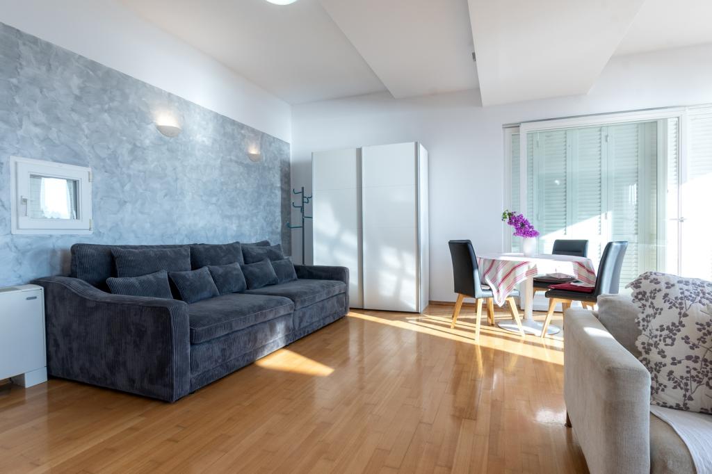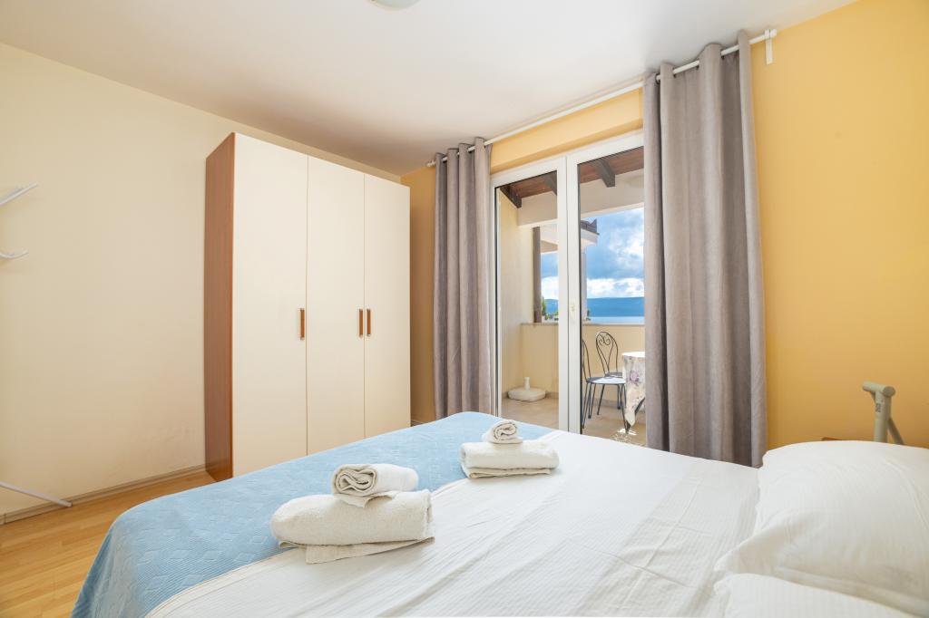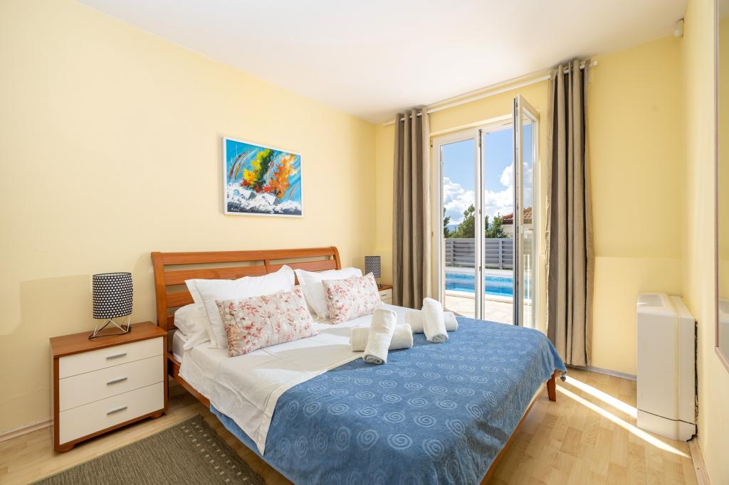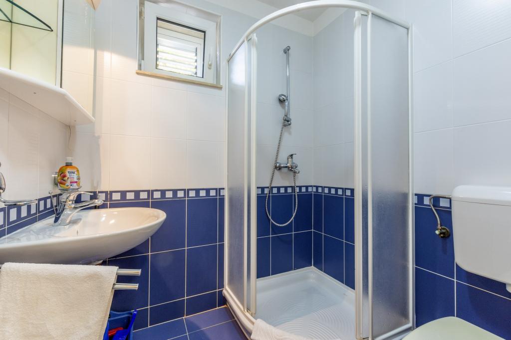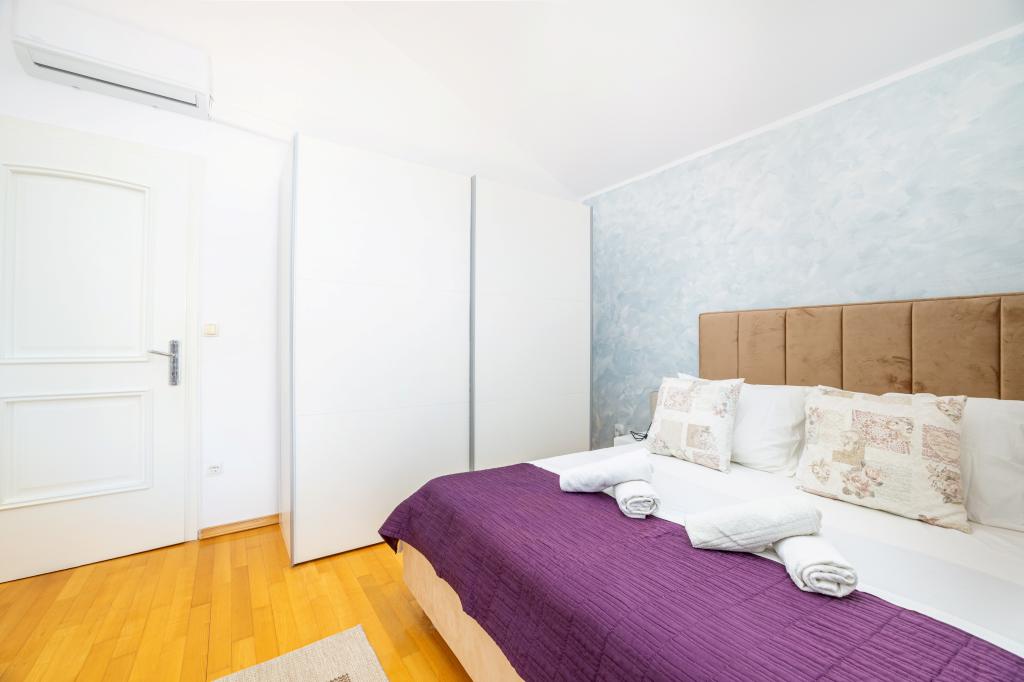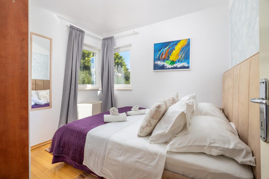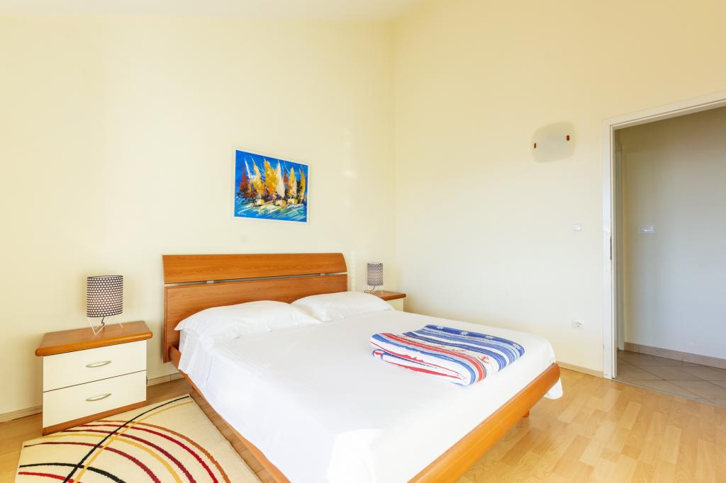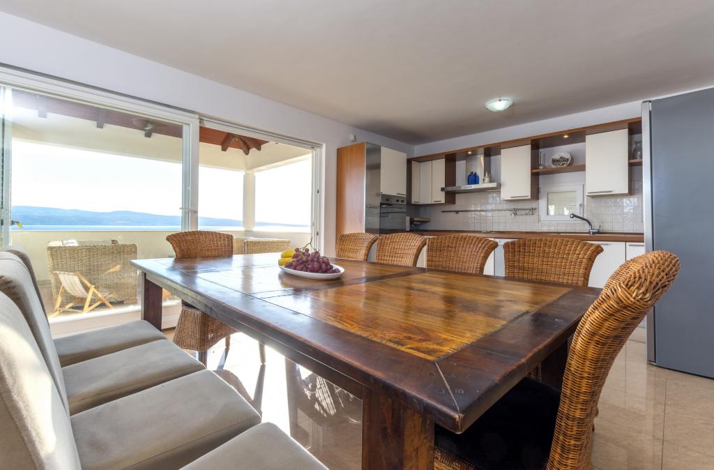 Ubytování v nově postavených, mimořádně pohodlných a skvěle vybavených apartmánech. Objekt se nachází 3 km od centra Omiše. Celkem osm apartmánů, které se nacházejí v první řadě u moře. Všechny apartmány mají velké terasy s výhledem na moře a ostrov Brač. Parkovací místa přímo u vily. Apartmány se nacházejí pod hlavní silnicí (300 metrů), přímo u moře a velké oblázkové pláže. K dispozici jsou čtyři typy apartmánů: -- typ 2+2 se samostatnou dvoulůžkovou ložnicí a obývacím pokojem se dvěma lůžky, -- dále apartmány typu 2+2 velké studio, -- velké lux. apartmány typu 4+2 se dvěma dvoulůžkovými ložnicemi a velkým obývacím pokojem se dvěma rozkládacími lůžky a -- velký de lux. apartmán typu 14+2, ve skutečnosti vila na třech podlažích o rozloze 300 m2, s bazénem o rozměrech 9x4 metry s vyhřívanou vodou, se sedmi dvoulůžkovými ložnicemi, dvěma velkými obývacími pokoji s balkony a terasami, čtyřmi koupelnami, samostatnou toaletou, venkovním grilem, saunou a posilovnou atd. Bazén je výhradně využíván apartmánem A 14+2. Ostatní byty ne.