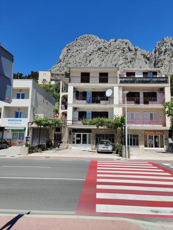 Dům se nachází u vchodu do Omiše od Splitu. Naproti domu se nachází v nákupním centru Studenac, autokemp Racek nabízí řadu sportovních a rekreačních zařízení, a Dino zábavní park a zábavní park pro malé i velké. Pláž je 200 metrů daleko a Omiš střediskem turistické 800m (10 minut chůze).