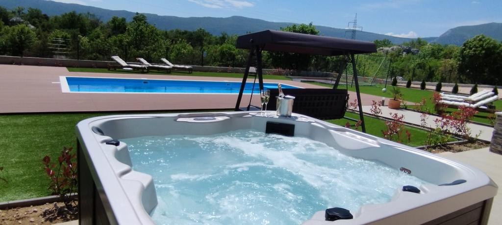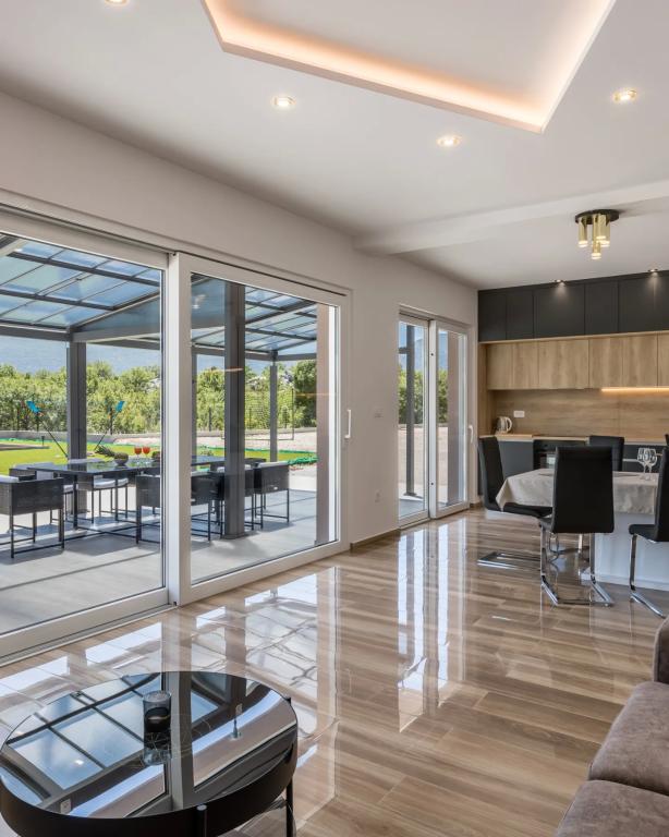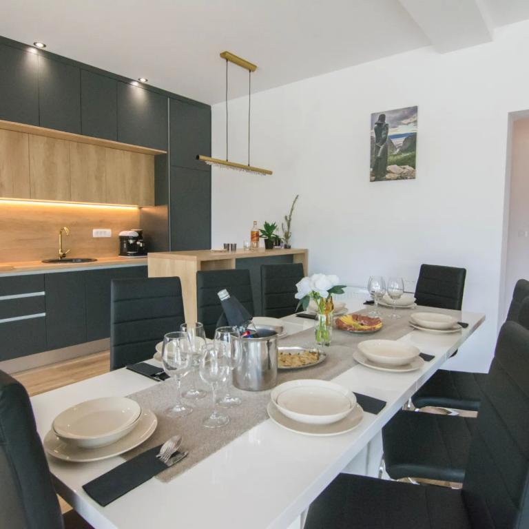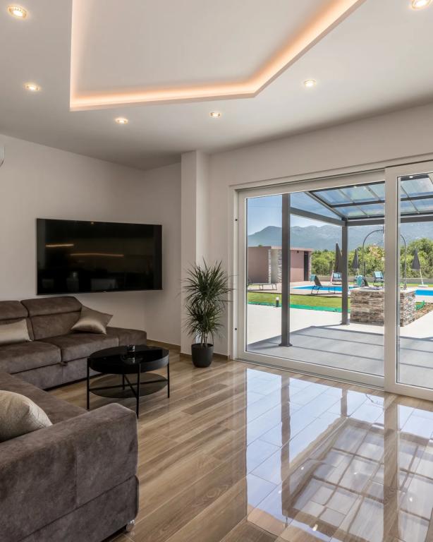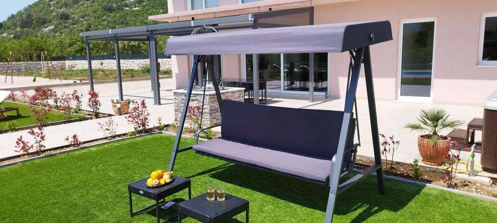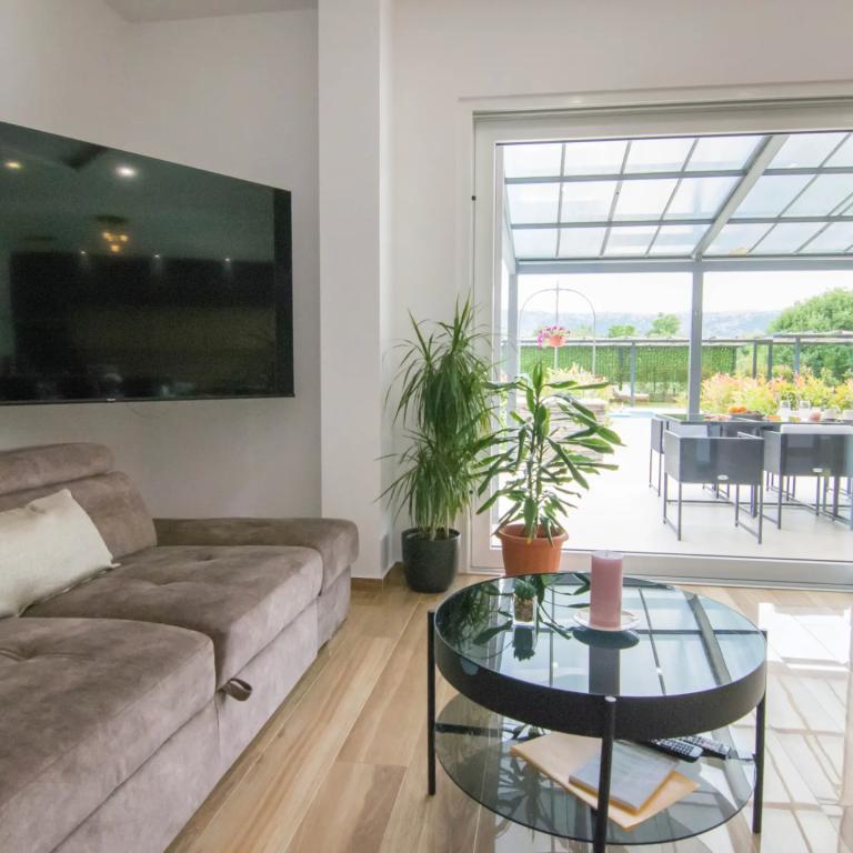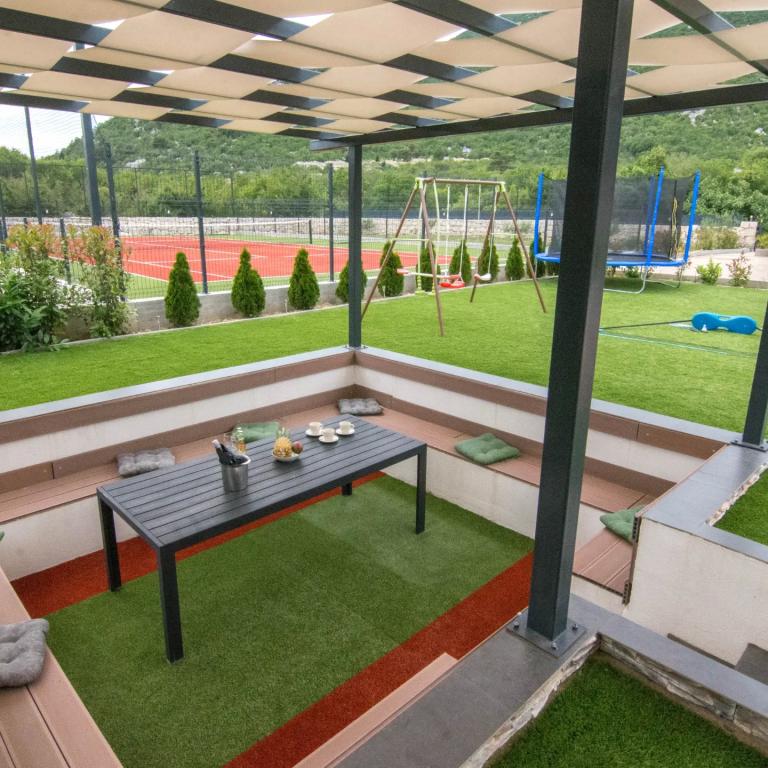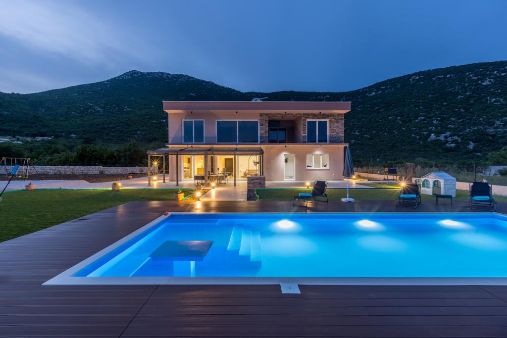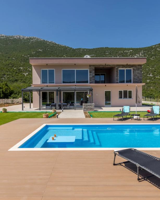 Villa Sky se nachází nedaleko Omiše v krásné přírodě. Je obklopen zelení, loukami a trávníky, je skvělý pro rodiny a skupiny, protože máte své soukromí, první dům je 4 km daleko. Jste v domě sami se svými blízkými. Vila má přízemní plochu 240 m2 a dvůr cca 2800 m2. Celý areál je oplocený kvůli dětem a domácím mazlíčkům. Má 3 pokoje pro dva, 1 pro tři, 3 koupelny a WC. Společné WC s pračkou a sušičkou. Velký obývací pokoj, kam se vejde postel pro 1 dospělou osobu, velká kuchyně s jídelnou a sáňkami. K rekreaci si zahrajte tenis nebo malou kopanou, badminton... Před domem je bazén 4×10, vířivka pro 5 osob, velký venkovní stůl a gril. K příjemnému posezení na čerstvém vzduchu slouží lounge bar. Děti mají hřiště. Parkoviště pokryté zelení. V případě jakýchkoliv dotazů mě neváhejte kontaktovat, rád pomohu. Pokud dáváte přednost moři, za 20 minut máte v Omiši písečnou a oblázkovou pláž.